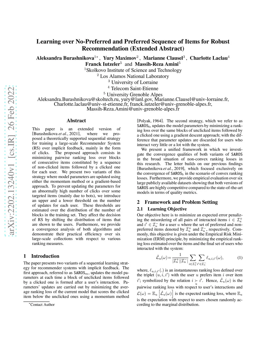 This paper is an extended version of [Burashnikova et al., 2021, arXiv: 2012.06910], where we proposed a theoretically supported sequential strategy for training a large-scale Recommender System (RS) over implicit feedback, mainly in the form of clicks. The proposed approach consists in minimizing pairwise ranking loss over blocks of consecutive items constituted by a sequence of non-clicked items followed by a clicked one for each user. We present two variants of this strategy where model parameters are updated using either the momentum method or a gradient-based approach. To prevent updating the parameters for an abnormally high number of clicks over some targeted items (mainly due to bots), we introduce an upper and a lower threshold on the number of updates for each user. These thresholds are estimated over the distribution of the number of blocks in the training set. They affect the decision of RS by shifting the distribution of items that are shown to the users. Furthermore, we provide a convergence analysis of both algorithms and demonstrate their practical efficiency over six large-scale collections with respect to various ranking measures.