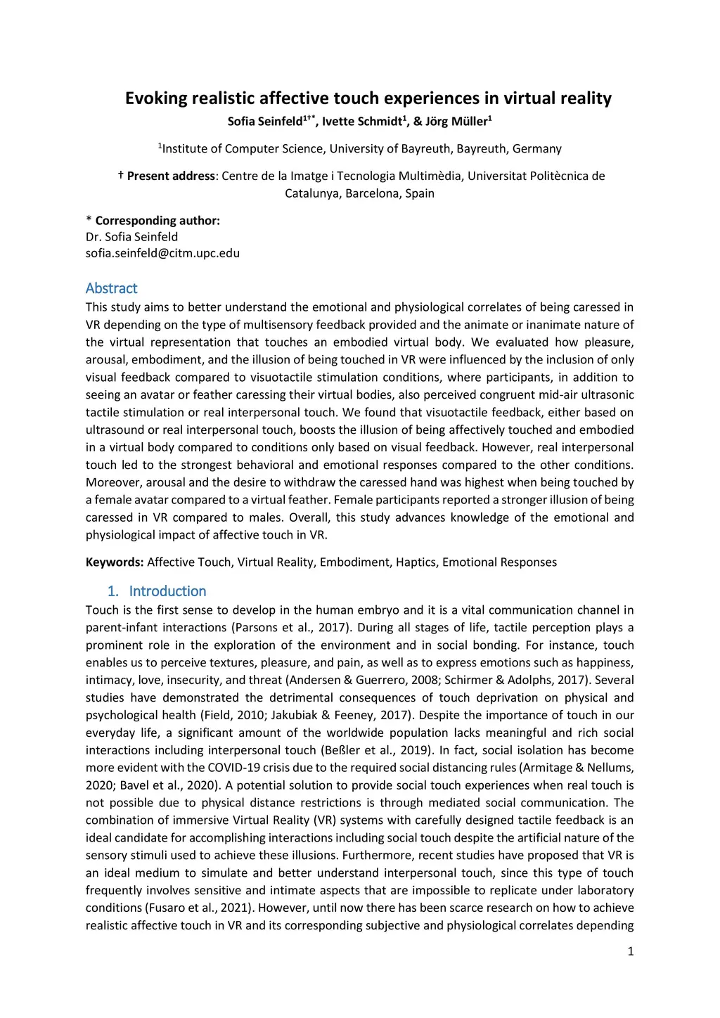 This study aims to better understand the emotional and physiological correlates of being caressed in VR depending on the type of multisensory feedback provided and the animate or inanimate nature of the virtual representation that touches an embodied virtual body. We evaluated how pleasure, arousal, embodiment, and the illusion of being touched in VR were influenced by the inclusion of only visual feedback compared to visuotactile stimulation conditions, where participants, in addition to seeing an avatar or feather caressing their virtual bodies, also perceived congruent mid-air ultrasonic tactile stimulation or real interpersonal touch. We found that visuotactile feedback, either based on ultrasound or real interpersonal touch, boosts the illusion of being affectively touched and embodied in a virtual body compared to conditions only based on visual feedback. However, real interpersonal touch led to the strongest behavioral and emotional responses compared to the other conditions. Moreover, arousal and the desire to withdraw the caressed hand was highest when being touched by a female avatar compared to a virtual feather. Female participants reported a stronger illusion of being caressed in VR compared to males. Overall, this study advances knowledge of the emotional and physiological impact of affective touch in VR.