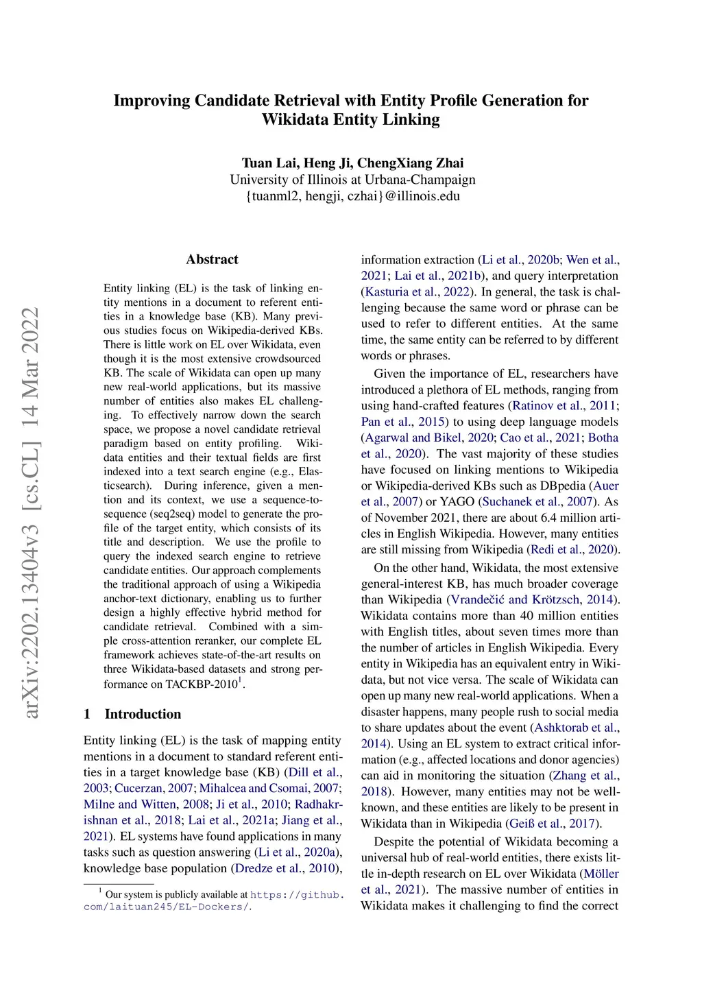 Entity linking (EL) is the task of linking entity mentions in a document to referent entities in a knowledge base (KB). Many previous studies focus on Wikipedia-derived KBs. There is little work on EL over Wikidata, even though it is the most extensive crowdsourced KB. The scale of Wikidata can open up many new real-world applications, but its massive number of entities also makes EL challenging. To effectively narrow down the search space, we propose a novel candidate retrieval paradigm based on entity profiling. Wikidata entities and their textual fields are first indexed into a text search engine (e.g., Elasticsearch). During inference, given a mention and its context, we use a sequence-to-sequence (seq2seq) model to generate the profile of the target entity, which consists of its title and description. We use the profile to query the indexed search engine to retrieve candidate entities. Our approach complements the traditional approach of using a Wikipedia anchor-text dictionary, enabling us to further design a highly effective hybrid method for candidate retrieval. Combined with a simple cross-attention reranker, our complete EL framework achieves state-of-the-art results on three Wikidata-based datasets and strong performance on TACKBP-2010.