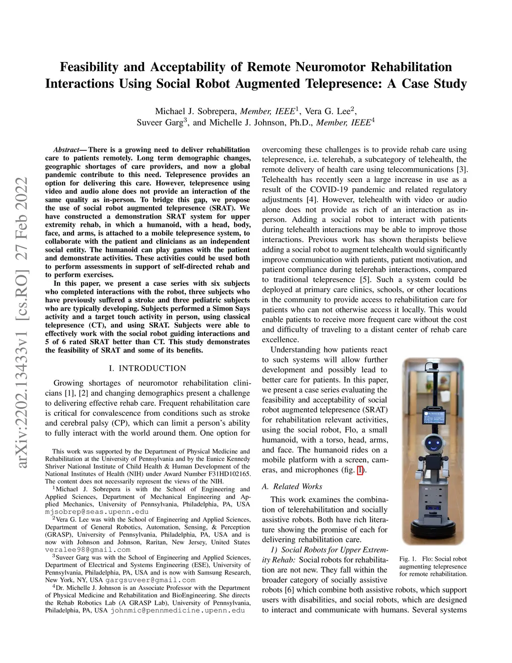 There is a growing need to deliver rehabilitation care to patients remotely. Long term demographic changes, geographic shortages of care providers, and now a global pandemic contribute to this need. Telepresence provides an option for delivering this care. However, telepresence using video and audio alone does not provide an interaction of the same quality as in-person. To bridge this gap, we propose the use of social robot augmented telepresence (SRAT). We have constructed a demonstration SRAT system for upper extremity rehab, in which a humanoid, with a head, body, face, and arms, is attached to a mobile telepresence system, to collaborate with the patient and clinicians as an independent social entity. The humanoid can play games with the patient and demonstrate activities.These activities could be used both to perform assessments in support of self-directed rehab and to perform exercises. In this paper, we present a case series with six subjects who completed interactions with the robot, three subjects who have previously suffered a stroke and three pediatric subjects who are typically developing. Subjects performed a Simon Says activity and a target touch activity in person, using classical telepresence (CT), and using SRAT. Subjects were able to effectively work with the social robot guiding interactions and 5 of 6 rated SRAT better than CT. This study demonstrates the feasibility of SRAT and some of its benefits.
