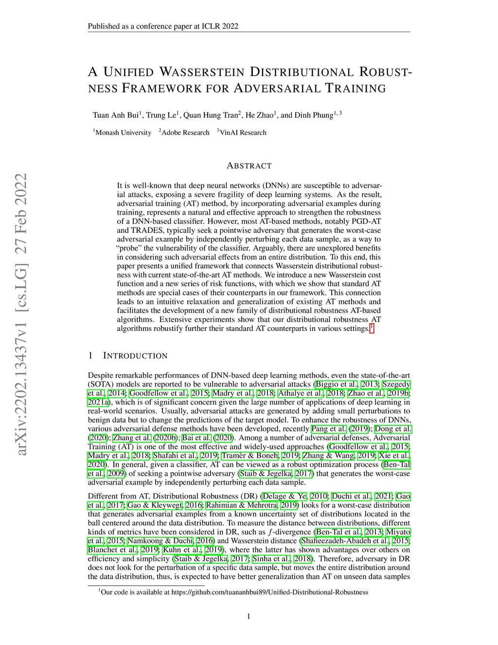 It is well-known that deep neural networks (DNNs) are susceptible to adversarial attacks, exposing a severe fragility of deep learning systems. As the result, adversarial training (AT) method, by incorporating adversarial examples during training, represents a natural and effective approach to strengthen the robustness of a DNN-based classifier. However, most AT-based methods, notably PGD-AT and TRADES, typically seek a pointwise adversary that generates the worst-case adversarial example by independently perturbing each data sample, as a way to "probe" the vulnerability of the classifier. Arguably, there are unexplored benefits in considering such adversarial effects from an entire distribution. To this end, this paper presents a unified framework that connects Wasserstein distributional robustness with current state-of-the-art AT methods. We introduce a new Wasserstein cost function and a new series of risk functions, with which we show that standard AT methods are special cases of their counterparts in our framework. This connection leads to an intuitive relaxation and generalization of existing AT methods and facilitates the development of a new family of distributional robustness AT-based algorithms. Extensive experiments show that our distributional robustness AT algorithms robustify further their standard AT counterparts in various settings.