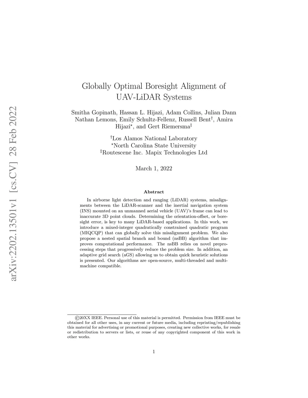 In airborne light detection and ranging (LiDAR) systems, misalignments between the LiDAR-scanner and the inertial navigation system (INS) mounted on an unmanned aerial vehicle (UAV)'s frame can lead to inaccurate 3D point clouds. Determining the orientation offset, or boresight error is key to many LiDAR-based applications. In this work, we introduce a mixed-integer quadratically constrained quadratic program (MIQCQP) that can globally solve this misalignment problem. We also propose a nested spatial branch and bound (nsBB) algorithm that improves computational performance. The nsBB relies on novel preprocessing steps that progressively reduce the problem size. In addition, an adaptive grid search (aGS) allowing us to obtain quick heuristic solutions is presented. Our algorithms are open-source, multi-threaded and multi-machine compatible.