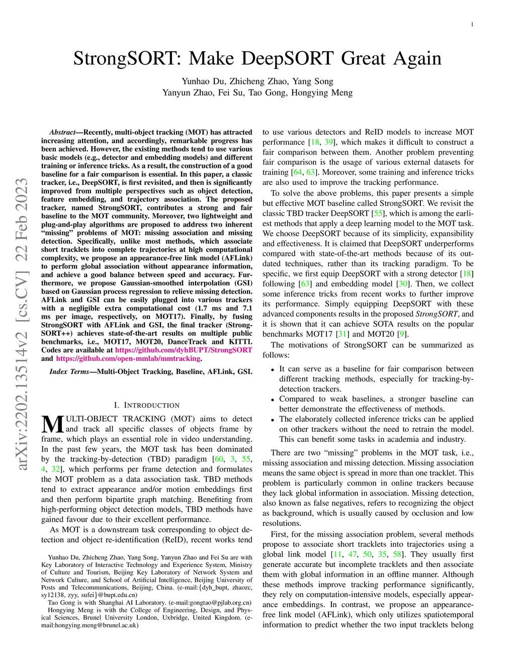 Recently, Multi-Object Tracking (MOT) has attracted rising attention, and accordingly, remarkable progresses have been achieved. However, the existing methods tend to use various basic models (e.g, detector and embedding model), and different training or inference tricks, etc. As a result, the construction of a good baseline for a fair comparison is essential. In this paper, a classic tracker, i.e., DeepSORT, is first revisited, and then is significantly improved from multiple perspectives such as object detection, feature embedding, and trajectory association. The proposed tracker, named StrongSORT, contributes a strong and fair baseline for the MOT community. Moreover, two lightweight and plug-and-play algorithms are proposed to address two inherent "missing" problems of MOT: missing association and missing detection. Specifically, unlike most methods, which associate short tracklets into complete trajectories at high computation complexity, we propose an appearance-free link model (AFLink) to perform global association without appearance information, and achieve a good balance between speed and accuracy. Furthermore, we propose a Gaussian-smoothed interpolation (GSI) based on Gaussian process regression to relieve the missing detection. AFLink and GSI can be easily plugged into various trackers with a negligible extra computational cost (1.7 ms and 7.1 ms per image, respectively, on MOT17). Finally, by fusing StrongSORT with AFLink and GSI, the final tracker (StrongSORT++) achieves state-of-the-art results on multiple public benchmarks, i.e., MOT17, MOT20, DanceTrack and KITTI. Codes are available at https://github.com/dyhBUPT/StrongSORT and https://github.com/open-mmlab/mmtracking.