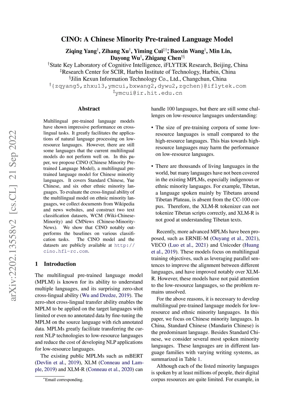 Multilingual pre-trained language models have shown impressive performance on cross-lingual tasks. It greatly facilitates the applications of natural language processing on low-resource languages. However, there are still some languages that the current multilingual models do not perform well on. In this paper, we propose CINO (Chinese Minority Pre-trained Language Model), a multilingual pre-trained language model for Chinese minority languages. It covers Standard Chinese, Yue Chinese, and six other ethnic minority languages. To evaluate the cross-lingual ability of the multilingual model on ethnic minority languages, we collect documents from Wikipedia and news websites, and construct two text classification datasets, WCM (Wiki-Chinese-Minority) and CMNews (Chinese-Minority-News). We show that CINO notably outperforms the baselines on various classification tasks. The CINO model and the datasets are publicly available at http://cino.hfl-rc.com.