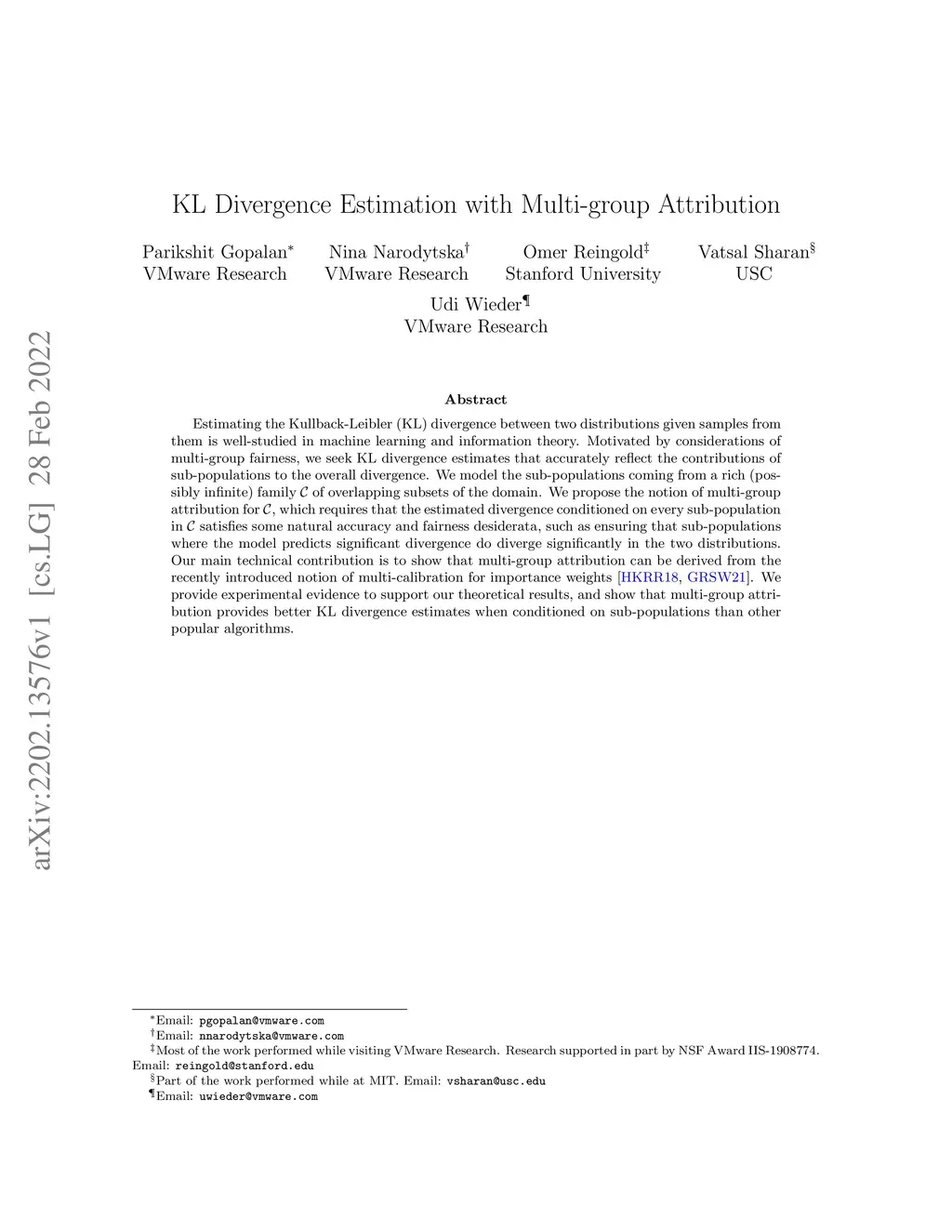 Estimating the Kullback-Leibler (KL) divergence between two distributions given samples from them is well-studied in machine learning and information theory. Motivated by considerations of multi-group fairness, we seek KL divergence estimates that accurately reflect the contributions of sub-populations to the overall divergence. We model the sub-populations coming from a rich (possibly infinite) family of overlapping subsets of the domain. We propose the notion of multi-group attribution for , which requires that the estimated divergence conditioned on every sub-population in satisfies some natural accuracy and fairness desiderata, such as ensuring that sub-populations where the model predicts significant divergence do diverge significantly in the two distributions. Our main technical contribution is to show that multi-group attribution can be derived from the recently introduced notion of multi-calibration for importance weights [HKRR18, GRSW21]. We provide experimental evidence to support our theoretical results, and show that multi-group attribution provides better KL divergence estimates when conditioned on sub-populations than other popular algorithms.