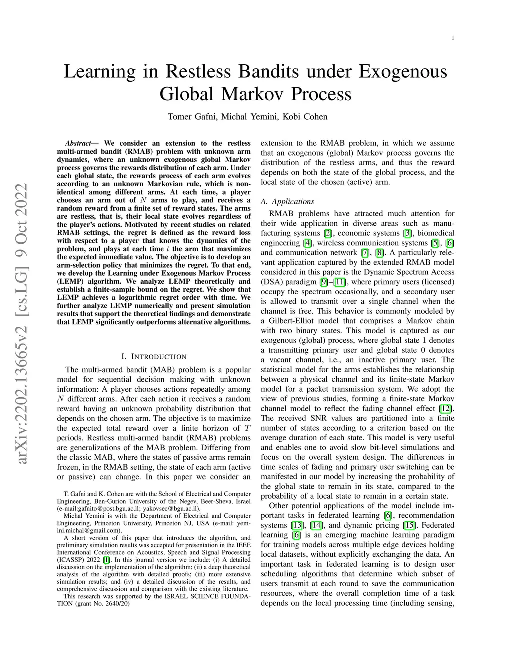We consider an extension to the restless multi-armed bandit (RMAB) problem with unknown arm dynamics, where an unknown exogenous global Markov process governs the rewards distribution of each arm. Under each global state, the rewards process of each arm evolves according to an unknown Markovian rule, which is non-identical among different arms. At each time, a player chooses an arm out of N arms to play, and receives a random reward from a finite set of reward states. The arms are restless, that is, their local state evolves regardless of the player's actions. Motivated by recent studies on related RMAB settings, the regret is defined as the reward loss with respect to a player that knows the dynamics of the problem, and plays at each time t the arm that maximizes the expected immediate value. The objective is to develop an arm-selection policy that minimizes the regret. To that end, we develop the Learning under Exogenous Markov Process (LEMP) algorithm. We analyze LEMP theoretically and establish a finite-sample bound on the regret. We show that LEMP achieves a logarithmic regret order with time. We further analyze LEMP numerically and present simulation results that support the theoretical findings and demonstrate that LEMP significantly outperforms alternative algorithms.