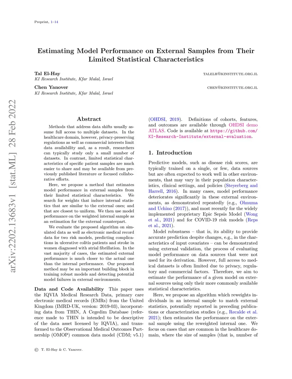 Estimating Model Performance on External Samples from Their Limited