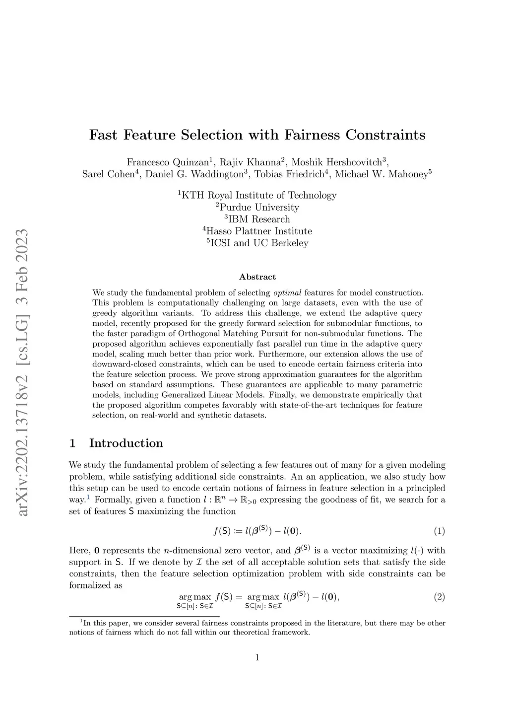 We study the fundamental problem of selecting optimal features for model construction. This problem is computationally challenging on large datasets, even with the use of greedy algorithm variants. To address this challenge, we extend the adaptive query model, recently proposed for the greedy forward selection for submodular functions, to the faster paradigm of Orthogonal Matching Pursuit for non-submodular functions. The proposed algorithm achieves exponentially fast parallel run time in the adaptive query model, scaling much better than prior work. Furthermore, our extension allows the use of downward-closed constraints, which can be used to encode certain fairness criteria into the feature selection process. We prove strong approximation guarantees for the algorithm based on standard assumptions. These guarantees are applicable to many parametric models, including Generalized Linear Models. Finally, we demonstrate empirically that the proposed algorithm competes favorably with state-of-the-art techniques for feature selection, on real-world and synthetic datasets.