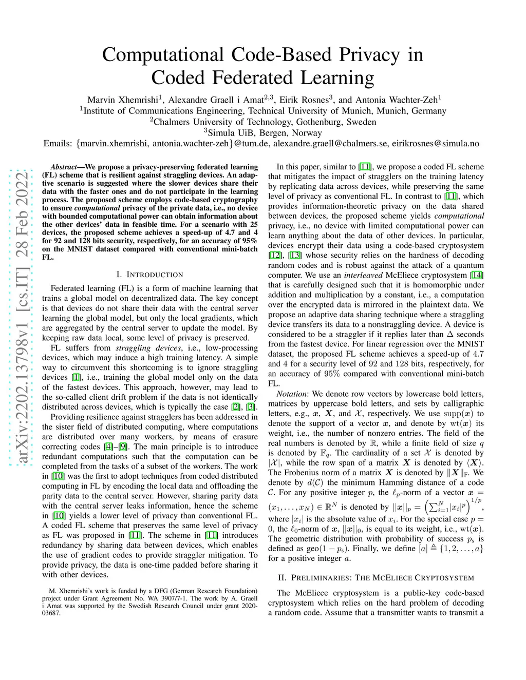 We propose a privacy-preserving federated learning (FL) scheme that is resilient against straggling devices. An adaptive scenario is suggested where the slower devices share their data with the faster ones and do not participate in the learning process. The proposed scheme employs code-based cryptography to ensure \emph{computational} privacy of the private data, i.e., no device with bounded computational power can obtain information about the other devices' data in feasible time. For a scenario with 25 devices, the proposed scheme achieves a speed-up of 4.7 and 4 for 92 and 128 bits security, respectively, for an accuracy of 95\% on the MNIST dataset compared with conventional mini-batch FL.