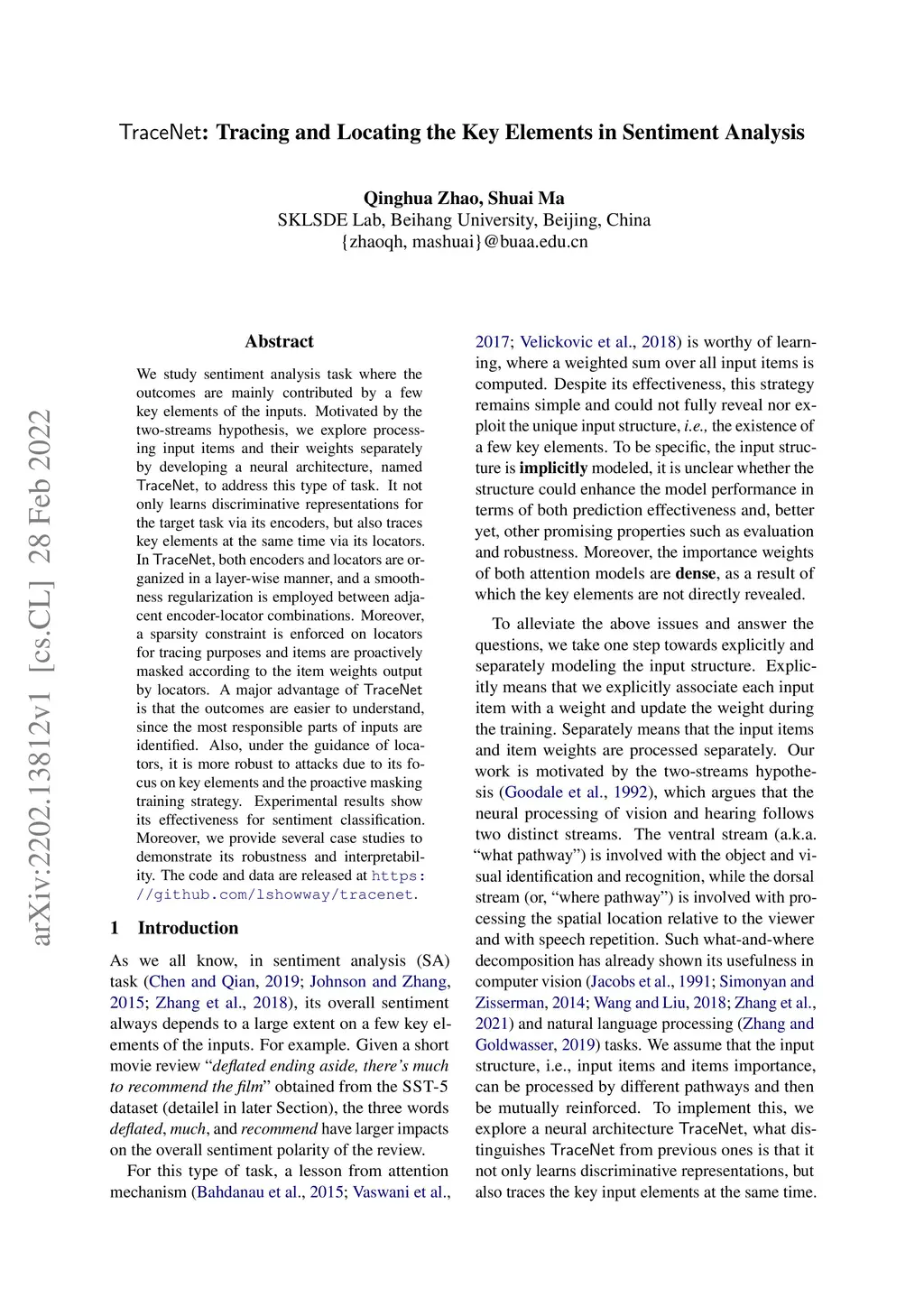 In this paper, we study sentiment analysis task where the outcomes are mainly contributed by a few key elements of the inputs. Motivated by the two-streams hypothesis, we propose a neural architecture, named TraceNet, to address this type of task. It not only learns discriminative representations for the target task via its encoders, but also traces key elements at the same time via its locators. In TraceNet, both encoders and locators are organized in a layer-wise manner, and a smoothness regularization is employed between adjacent encoder-locator combinations. Moreover, a sparsity constraints are enforced on locators for tracing purposes and items are proactively masked according to the item weights output by locators.A major advantage of TraceNet is that the outcomes are easier to understand, since the most responsible parts of inputs are identified. Also, under the guidance of locators, it is more robust to attacks due to its focus on key elements and the proactive masking training strategy. Experimental results show its effectiveness for sentiment classification. Moreover, we provide several case studies to demonstrate its robustness and interpretability.