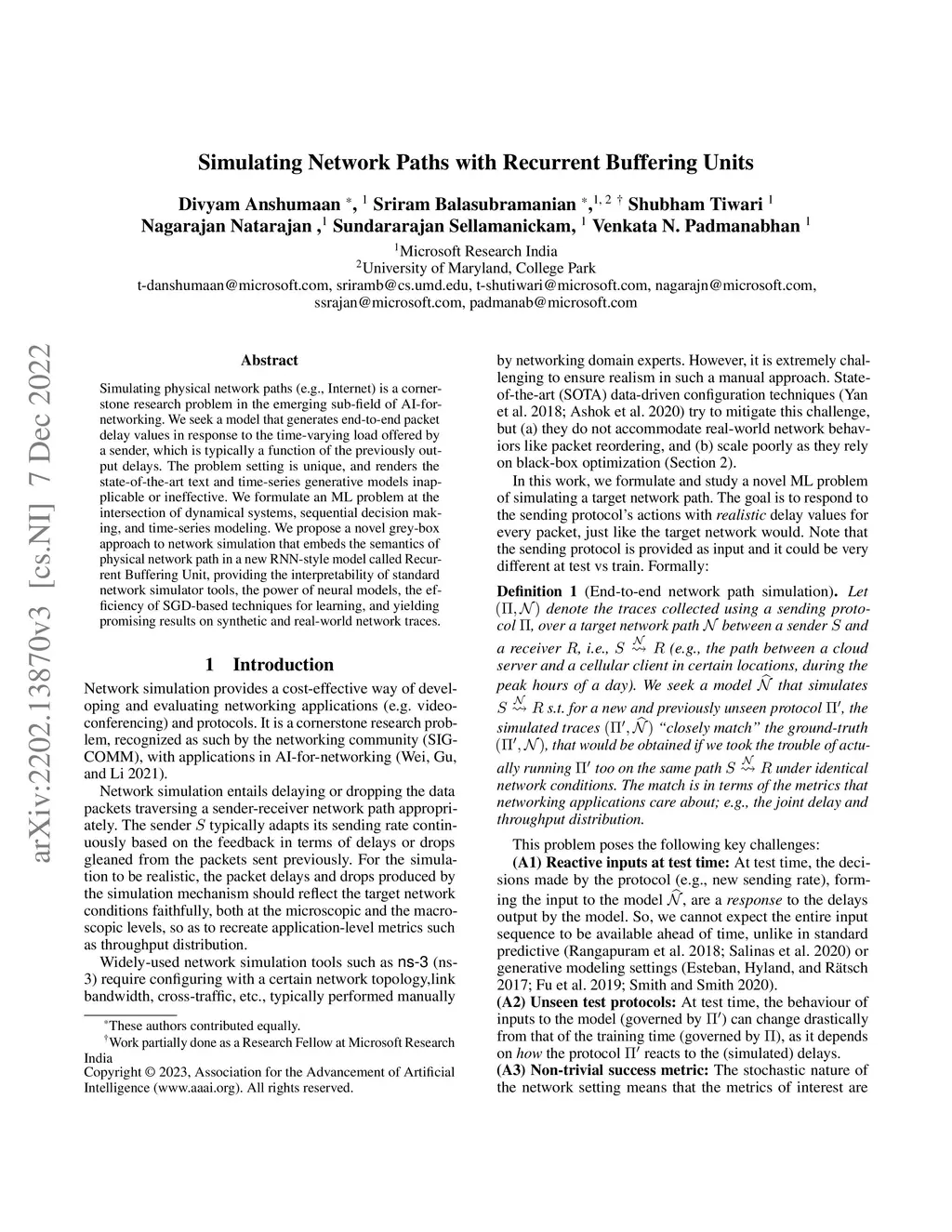 Simulating physical network paths (e.g., Internet) is a cornerstone research problem in the emerging sub-field of AI-for-networking. We seek a model that generates end-to-end packet delay values in response to the time-varying load offered by a sender, which is typically a function of the previously output delays. The problem setting is unique, and renders the state-of-the-art text and time-series generative models inapplicable or ineffective. We formulate an ML problem at the intersection of dynamical systems, sequential decision making, and time-series modeling. We propose a novel grey-box approach to network simulation that embeds the semantics of physical network path in a new RNN-style model called RBU, providing the interpretability of standard network simulator tools, the power of neural models, the efficiency of SGD-based techniques for learning, and yielding promising results on synthetic and real-world network traces.