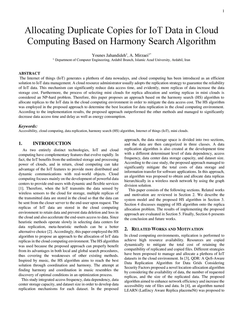 The Internet of things (IoT) generates a plethora of data nowadays, and cloud computing has been introduced as an efficient solution to IoT data management. A cloud resource administrator usually adopts the replication strategy to guarantee the reliability of IoT data. This mechanism can significantly reduce data access time, and evidently, more replicas of data increase the data storage cost. Furthermore, the process of selecting mini clouds for replica allocation and sorting replicas in mini clouds is considered an NP-hard problem. Therefore, this paper proposes an approach based on the harmony search (HS) algorithm to allocate replicas to the IoT data in the cloud computing environment in order to mitigate the data access cost. The HS algorithm was employed in the proposed approach to determine the best location for data replication in the cloud computing environment. According to the implementation results, the proposed approach outperformed the other methods and managed to significantly decrease data access time and delay as well as energy consumption.