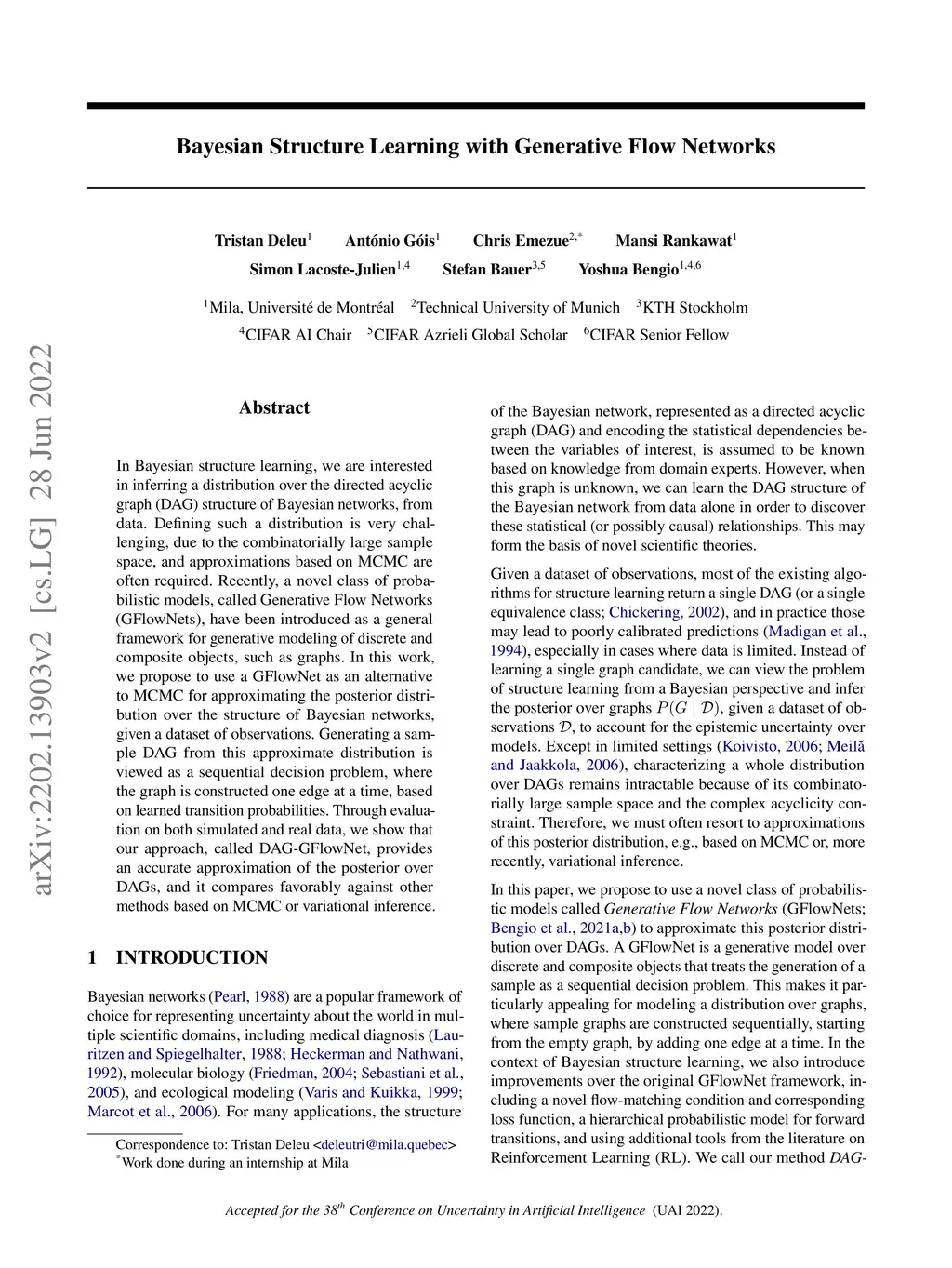 In Bayesian structure learning, we are interested in inferring a distribution over the directed acyclic graph (DAG) structure of Bayesian networks, from data. Defining such a distribution is very challenging, due to the combinatorially large sample space, and approximations based on MCMC are often required. Recently, a novel class of probabilistic models, called Generative Flow Networks (GFlowNets), have been introduced as a general framework for generative modeling of discrete and composite objects, such as graphs. In this work, we propose to use a GFlowNet as an alternative to MCMC for approximating the posterior distribution over the structure of Bayesian networks, given a dataset of observations. Generating a sample DAG from this approximate distribution is viewed as a sequential decision problem, where the graph is constructed one edge at a time, based on learned transition probabilities. Through evaluation on both simulated and real data, we show that our approach, called DAG-GFlowNet, provides an accurate approximation of the posterior over DAGs, and it compares favorably against other methods based on MCMC or variational inference.