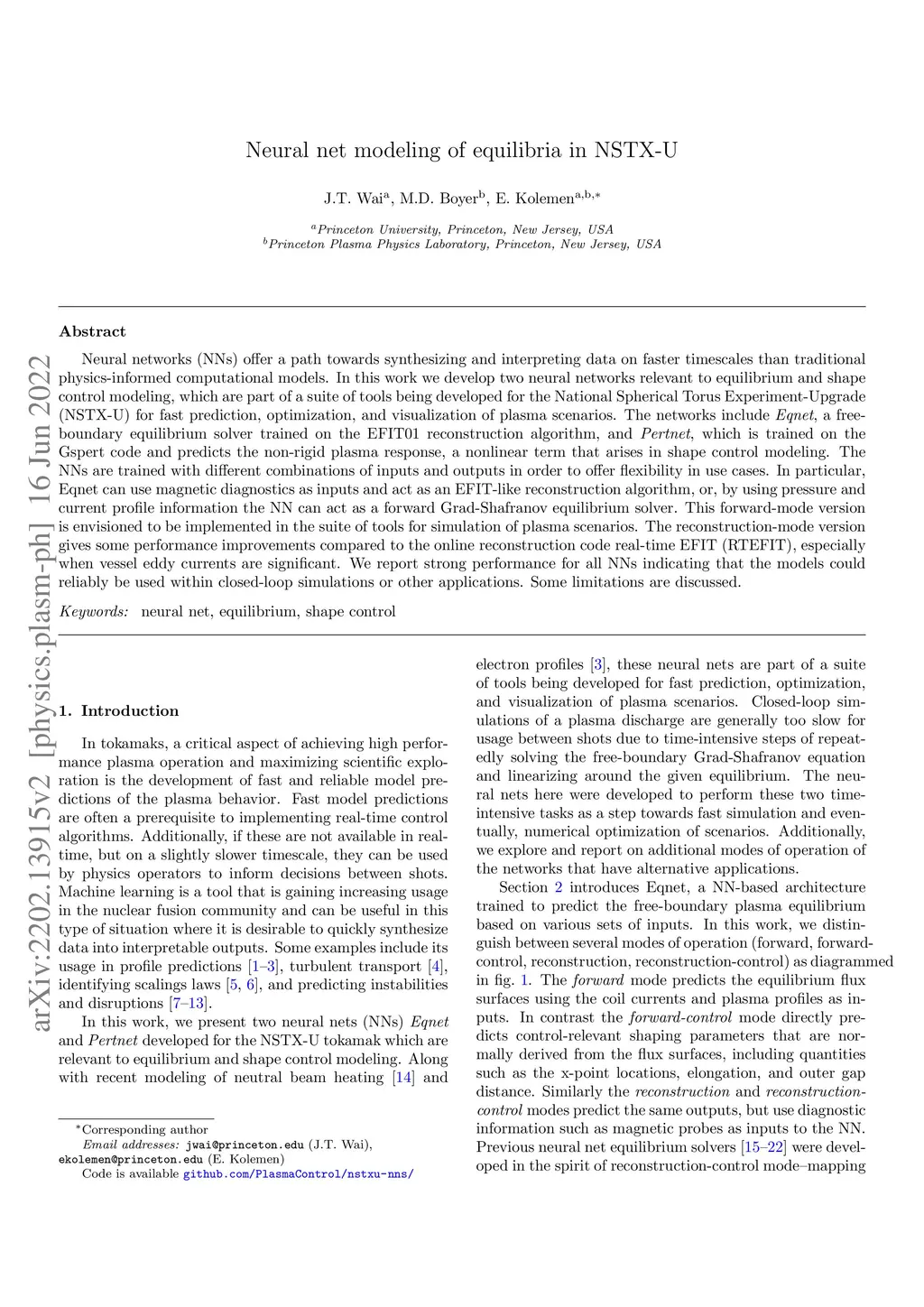 Neural networks (NNs) offer a path towards synthesizing and interpreting data on faster timescales than traditional physics-informed computational models. In this work we develop two neural networks relevant to equilibrium and shape control modeling, which are part of a suite of tools being developed for the National Spherical Torus Experiment-Upgrade (NSTX-U) for fast prediction, optimization, and visualization of plasma scenarios. The networks include Eqnet, a free-boundary equilibrium solver trained on the EFIT01 reconstruction algorithm, and Pertnet, which is trained on the Gspert code and predicts the non-rigid plasma response, a nonlinear term that arises in shape control modeling. The NNs are trained with different combinations of inputs and outputs in order to offer flexibility in use cases. In particular, Eqnet can use magnetic diagnostics as inputs and act as an EFIT-like reconstruction algorithm, or, by using pressure and current profile information the NN can act as a forward Grad-Shafranov equilibrium solver. This forward-mode version is envisioned to be implemented in the suite of tools for simulation of plasma scenarios. The reconstruction-mode version gives some performance improvements compared to the online reconstruction code real-time EFIT (RTEFIT), especially when vessel eddy currents are significant. We report strong performance for all NNs indicating that the models could reliably be used within closed-loop simulations or other applications. Some limitations are discussed.