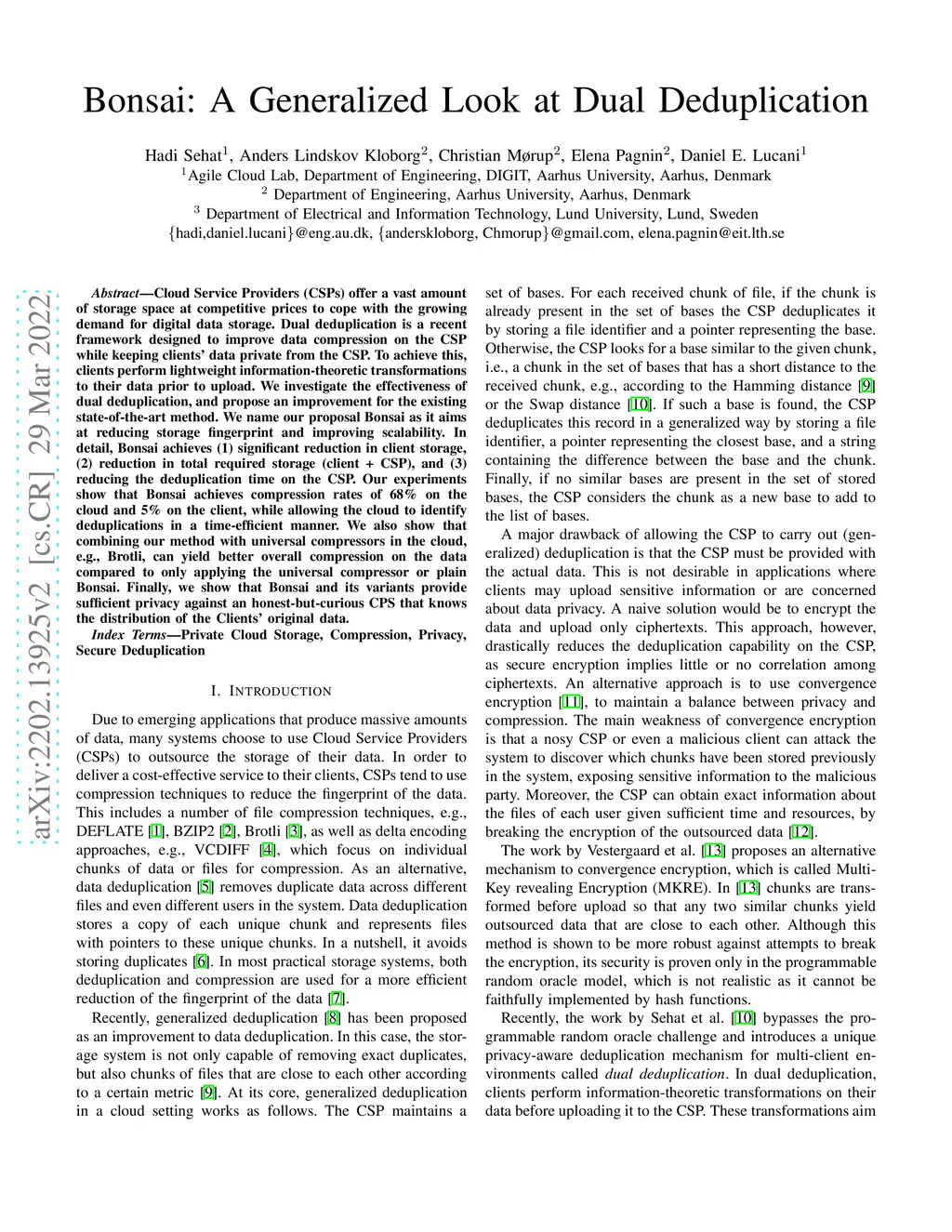 Cloud Service Providers (CSPs) offer a vast amount of storage space at competitive prices to cope with the growing demand for digital data storage. Dual deduplication is a recent framework designed to improve data compression on the CSP while keeping clients' data private from the CSP. To achieve this, clients perform lightweight information-theoretic transformations to their data prior to upload. We investigate the effectiveness of dual deduplication, and propose an improvement for the existing state-of-the-art method. We name our proposal Bonsai as it aims at reducing storage fingerprint and improving scalability. In detail, Bonsai achieves (1) significant reduction in client storage, (2) reduction in total required storage (client + CSP), and (3) reducing the deduplication time on the CSP. Our experiments show that Bonsai achieves compression rates of 68\% on the cloud and 5\% on the client, while allowing the cloud to identify deduplications in a time-efficient manner. We also show that combining our method with universal compressors in the cloud, e.g., Brotli, can yield better overall compression on the data compared to only applying the universal compressor or plain Bonsai. Finally, we show that Bonsai and its variants provide sufficient privacy against an honest-but-curious CPS that knows the distribution of the Clients' original data.