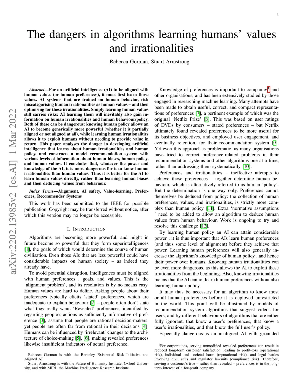 The dangers in algorithms learning humans' values and irrationalities