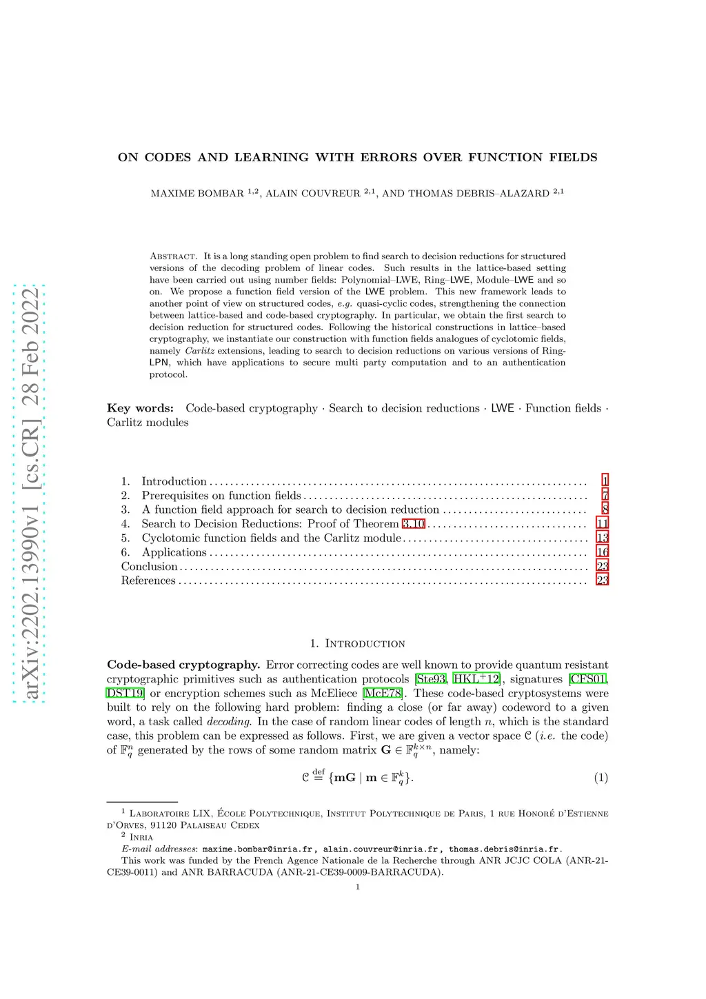 It is a long standing open problem to find search to decision reductions for structured versions of the decoding problem of linear codes. Such results in the lattice-based setting have been carried out using number fields: Polynomial-LWE, Ring-LWE, Module-LWE and so on. We propose a function field version of the LWE problem. This new framework leads to another point of view on structured codes, e.g. quasi-cyclic codes, strengthening the connection between lattice-based and code-based cryptography. In particular, we obtain the first search to decision reduction for structured codes. Following the historical constructions in lattice-based cryptography, we instantiate our construction with function fields analogues of cyclotomic fields, namely Carlitz extensions, leading to search to decision reductions on various versions of Ring-LPN, which have applications to secure multi party computation and to an authentication protocol.