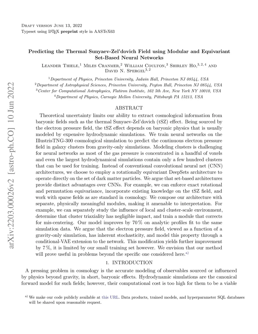 Theoretical uncertainty limits our ability to extract cosmological information from baryonic fields such as the thermal Sunyaev-Zel'dovich (tSZ) effect. Being sourced by the electron pressure field, the tSZ effect depends on baryonic physics that is usually modeled by expensive hydrodynamic simulations. We train neural networks on the IllustrisTNG-300 cosmological simulation to predict the continuous electron pressure field in galaxy clusters from gravity-only simulations. Modeling clusters is challenging for neural networks as most of the gas pressure is concentrated in a handful of voxels and even the largest hydrodynamical simulations contain only a few hundred clusters that can be used for training. Instead of conventional convolutional neural net (CNN) architectures, we choose to employ a rotationally equivariant DeepSets architecture to operate directly on the set of dark matter particles. We argue that set-based architectures provide distinct advantages over CNNs. For example, we can enforce exact rotational and permutation equivariance, incorporate existing knowledge on the tSZ field, and work with sparse fields as are standard in cosmology. We compose our architecture with separate, physically meaningful modules, making it amenable to interpretation. For example, we can separately study the influence of local and cluster-scale environment, determine that cluster triaxiality has negligible impact, and train a module that corrects for mis-centering. Our model improves by 70 % on analytic profiles fit to the same simulation data. We argue that the electron pressure field, viewed as a function of a gravity-only simulation, has inherent stochasticity, and model this property through a conditional-VAE extension to the network. This modification yields further improvement by 7 %, it is limited by our small training set however. (abridged)