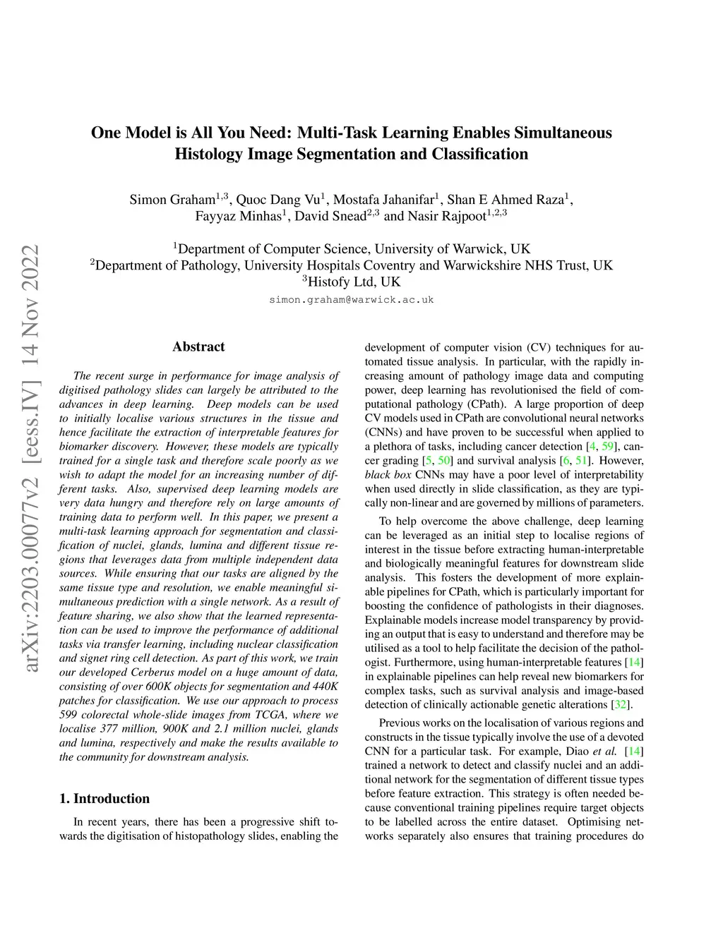 The recent surge in performance for image analysis of digitised pathology slides can largely be attributed to the advances in deep learning. Deep models can be used to initially localise various structures in the tissue and hence facilitate the extraction of interpretable features for biomarker discovery. However, these models are typically trained for a single task and therefore scale poorly as we wish to adapt the model for an increasing number of different tasks. Also, supervised deep learning models are very data hungry and therefore rely on large amounts of training data to perform well. In this paper, we present a multi-task learning approach for segmentation and classification of nuclei, glands, lumina and different tissue regions that leverages data from multiple independent data sources. While ensuring that our tasks are aligned by the same tissue type and resolution, we enable meaningful simultaneous prediction with a single network. As a result of feature sharing, we also show that the learned representation can be used to improve the performance of additional tasks via transfer learning, including nuclear classification and signet ring cell detection. As part of this work, we train our developed Cerberus model on a huge amount of data, consisting of over 600K objects for segmentation and 440K patches for classification. We use our approach to process 599 colorectal whole-slide images from TCGA, where we localise 377 million, 900K and 2.1 million nuclei, glands and lumina, respectively and make the results available to the community for downstream analysis.
