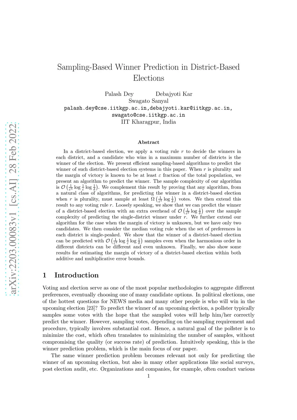 In a district-based election, we apply a voting rule to decide the winners in each district, and a candidate who wins in a maximum number of districts is the winner of the election. We present efficient sampling-based algorithms to predict the winner of such district-based election systems in this paper. When is plurality and the margin of victory is known to be at least fraction of the total population, we present an algorithm to predict the winner. The sample complexity of our algorithm is . We complement this result by proving that any algorithm, from a natural class of algorithms, for predicting the winner in a district-based election when is plurality, must sample at least votes. We then extend this result to any voting rule . Loosely speaking, we show that we can predict the winner of a district-based election with an extra overhead of over the sample complexity of predicting the single-district winner under . We further extend our algorithm for the case when the margin of victory is unknown, but we have only two candidates. We then consider the median voting rule when the set of preferences in each district is single-peaked. We show that the winner of a district-based election can be predicted with samples even when the harmonious order in different districts can be different and even unknown. Finally, we also show some results for estimating the margin of victory of a district-based election within both additive and multiplicative error bounds.