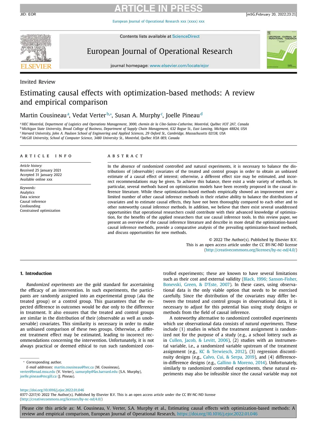 In the absence of randomized controlled and natural experiments, it is necessary to balance the distributions of (observable) covariates of the treated and control groups in order to obtain an unbiased estimate of a causal effect of interest; otherwise, a different effect size may be estimated, and incorrect recommendations may be given. To achieve this balance, there exist a wide variety of methods. In particular, several methods based on optimization models have been recently proposed in the causal inference literature. While these optimization-based methods empirically showed an improvement over a limited number of other causal inference methods in their relative ability to balance the distributions of covariates and to estimate causal effects, they have not been thoroughly compared to each other and to other noteworthy causal inference methods. In addition, we believe that there exist several unaddressed opportunities that operational researchers could contribute with their advanced knowledge of optimization, for the benefits of the applied researchers that use causal inference tools. In this review paper, we present an overview of the causal inference literature and describe in more detail the optimization-based causal inference methods, provide a comparative analysis of the prevailing optimization-based methods, and discuss opportunities for new methods.