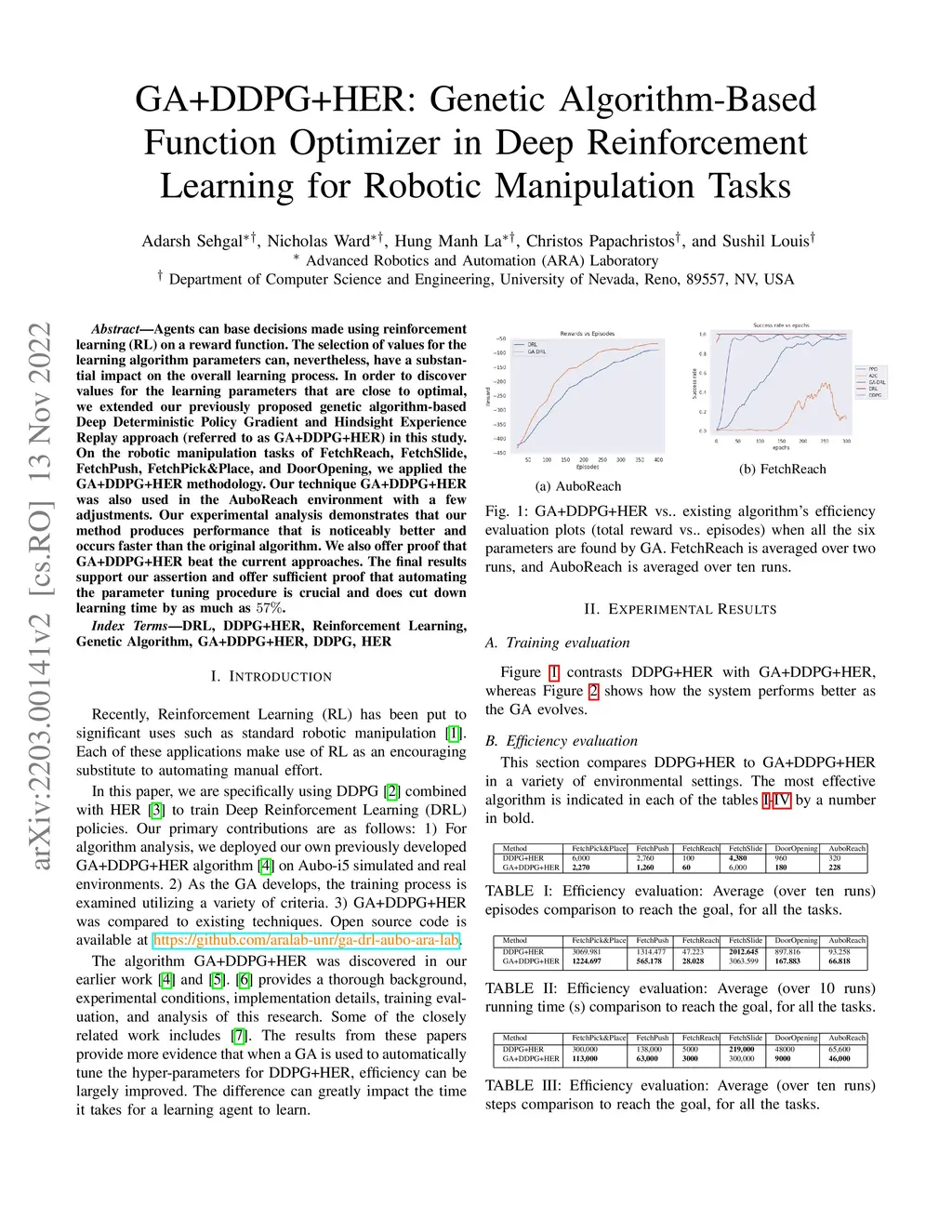 Agents can base decisions made using reinforcement learning (RL) on a reward function. The selection of values for the learning algorithm parameters can, nevertheless, have a substantial impact on the overall learning process. In order to discover values for the learning parameters that are close to optimal, we extended our previously proposed genetic algorithm-based Deep Deterministic Policy Gradient and Hindsight Experience Replay approach (referred to as GA+DDPG+HER) in this study. On the robotic manipulation tasks of FetchReach, FetchSlide, FetchPush, FetchPick&Place, and DoorOpening, we applied the GA+DDPG+HER methodology. Our technique GA+DDPG+HER was also used in the AuboReach environment with a few adjustments. Our experimental analysis demonstrates that our method produces performance that is noticeably better and occurs faster than the original algorithm. We also offer proof that GA+DDPG+HER beat the current approaches. The final results support our assertion and offer sufficient proof that automating the parameter tuning procedure is crucial and does cut down learning time by as much as 57%.