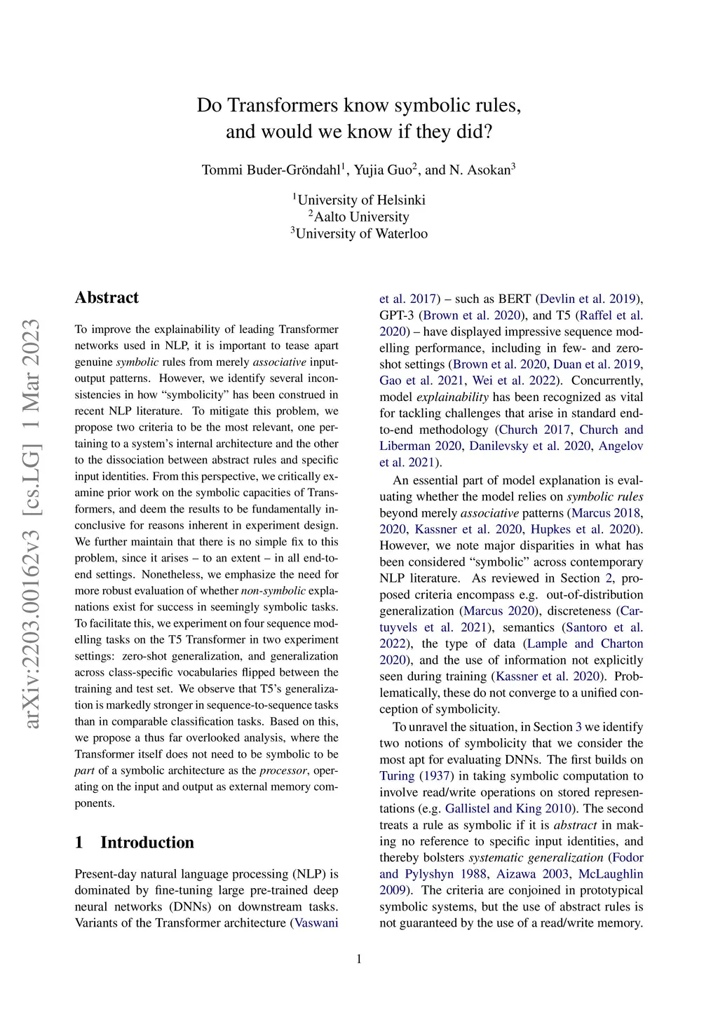 To improve the explainability of leading Transformer networks used in NLP, it is important to tease apart genuine symbolic rules from merely associative input-output patterns. However, we identify several inconsistencies in how ``symbolicity'' has been construed in recent NLP literature. To mitigate this problem, we propose two criteria to be the most relevant, one pertaining to a system's internal architecture and the other to the dissociation between abstract rules and specific input identities. From this perspective, we critically examine prior work on the symbolic capacities of Transformers, and deem the results to be fundamentally inconclusive for reasons inherent in experiment design. We further maintain that there is no simple fix to this problem, since it arises -- to an extent -- in all end-to-end settings. Nonetheless, we emphasize the need for more robust evaluation of whether non-symbolic explanations exist for success in seemingly symbolic tasks. To facilitate this, we experiment on four sequence modelling tasks on the T5 Transformer in two experiment settings: zero-shot generalization, and generalization across class-specific vocabularies flipped between the training and test set. We observe that T5's generalization is markedly stronger in sequence-to-sequence tasks than in comparable classification tasks. Based on this, we propose a thus far overlooked analysis, where the Transformer itself does not need to be symbolic to be part of a symbolic architecture as the processor, operating on the input and output as external memory components.