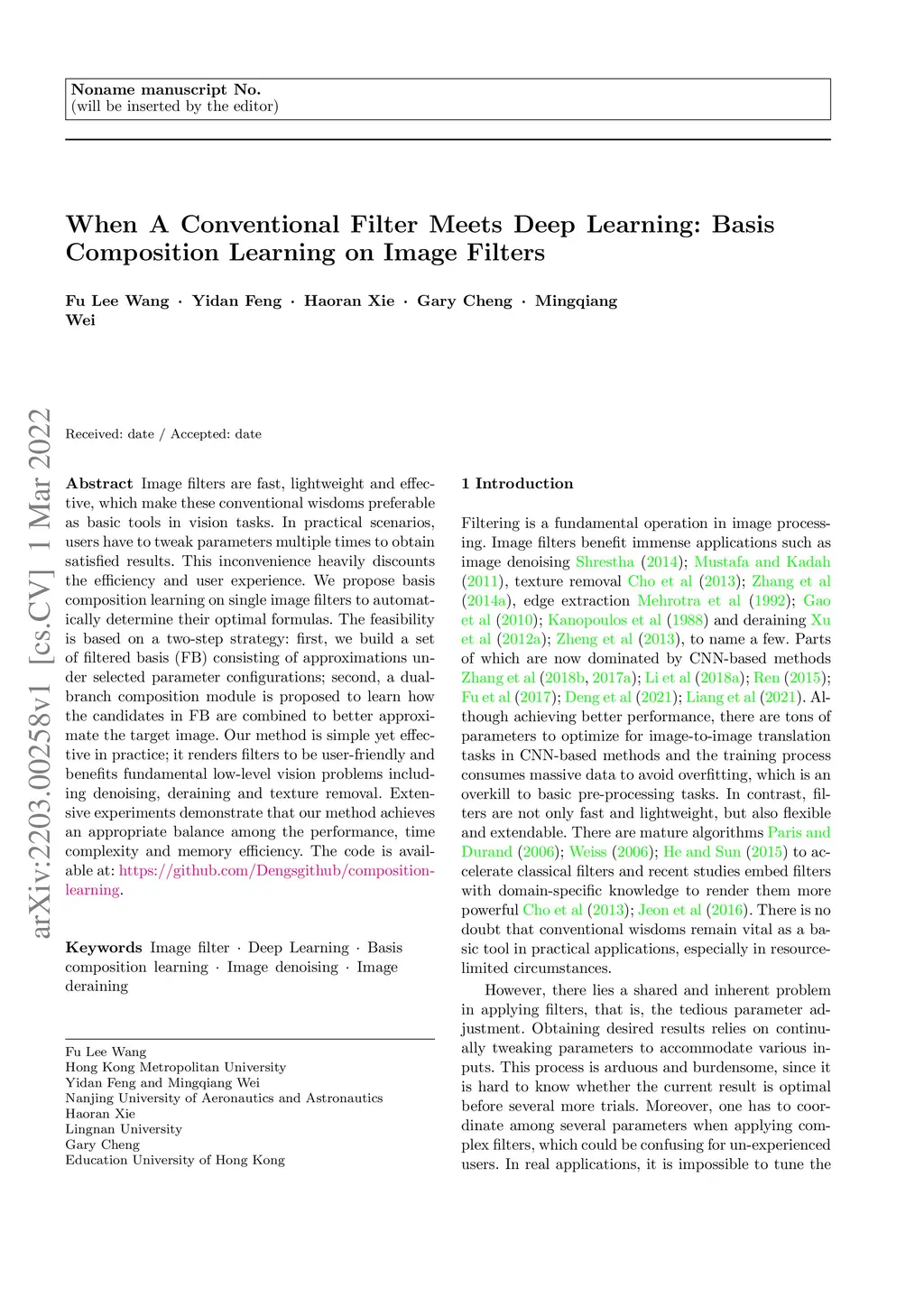 Image filters are fast, lightweight and effective, which make these conventional wisdoms preferable as basic tools in vision tasks. In practical scenarios, users have to tweak parameters multiple times to obtain satisfied results. This inconvenience heavily discounts the efficiency and user experience. We propose basis composition learning on single image filters to automatically determine their optimal formulas. The feasibility is based on a two-step strategy: first, we build a set of filtered basis (FB) consisting of approximations under selected parameter configurations; second, a dual-branch composition module is proposed to learn how the candidates in FB are combined to better approximate the target image. Our method is simple yet effective in practice; it renders filters to be user-friendly and benefits fundamental low-level vision problems including denoising, deraining and texture removal. Extensive experiments demonstrate that our method achieves an appropriate balance among the performance, time complexity and memory efficiency.