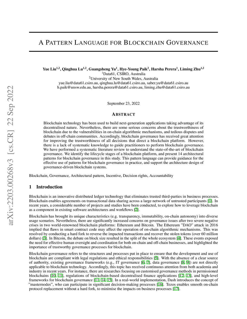 Blockchain technology has been used to build next-generation applications taking advantage of its decentralised nature. Nevertheless, there are some serious concerns about the trustworthiness of blockchain due to the vulnerabilities in on-chain algorithmic mechanisms, and tedious disputes and debates in off-chain communities. Accordingly, blockchain governance has received great attention for improving the trustworthiness of all decisions that direct a blockchain platform. However, there is a lack of systematic knowledge to guide practitioners to perform blockchain governance. We have performed a systematic literature review to understand the state-of-the-art of blockchain governance. We identify the lifecycle stages of a blockchain platform, and present 14 architectural patterns for blockchain governance in this study. This pattern language can provide guidance for the effective use of patterns for blockchain governance in practice, and support the architecture design of governance-driven blockchain systems.