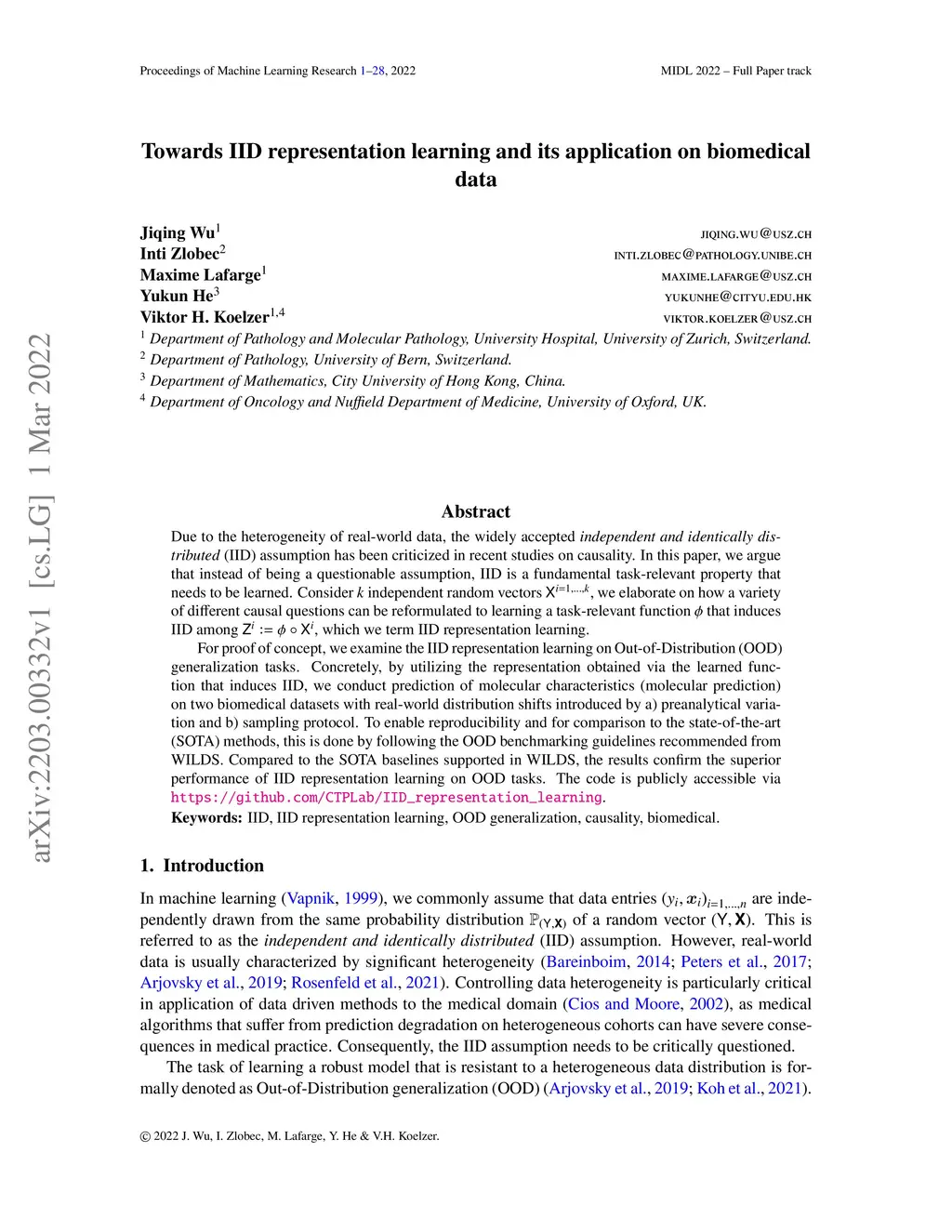 Due to the heterogeneity of real-world data, the widely accepted independent and identically distributed (IID) assumption has been criticized in recent studies on causality. In this paper, we argue that instead of being a questionable assumption, IID is a fundamental task-relevant property that needs to be learned. Consider independent random vectors , we elaborate on how a variety of different causal questions can be reformulated to learning a task-relevant function that induces IID among , which we term IID representation learning. For proof of concept, we examine the IID representation learning on Out-of-Distribution (OOD) generalization tasks. Concretely, by utilizing the representation obtained via the learned function that induces IID, we conduct prediction of molecular characteristics (molecular prediction) on two biomedical datasets with real-world distribution shifts introduced by a) preanalytical variation and b) sampling protocol. To enable reproducibility and for comparison to the state-of-the-art (SOTA) methods, this is done by following the OOD benchmarking guidelines recommended from WILDS. Compared to the SOTA baselines supported in WILDS, the results confirm the superior performance of IID representation learning on OOD tasks. The code is publicly accessible via https://github.com/CTPLab/IID_representation_learning.