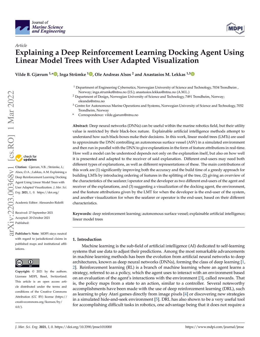 Deep neural networks (DNNs) can be useful within the marine robotics field, but their utility value is restricted by their black-box nature. Explainable artificial intelligence methods attempt to understand how such black-boxes make their decisions. In this work, linear model trees (LMTs) are used to approximate the DNN controlling an autonomous surface vessel (ASV) in a simulated environment and then run in parallel with the DNN to give explanations in the form of feature attributions in real-time. How well a model can be understood depends not only on the explanation itself, but also on how well it is presented and adapted to the receiver of said explanation. Different end-users may need both different types of explanations, as well as different representations of these. The main contributions of this work are (1) significantly improving both the accuracy and the build time of a greedy approach for building LMTs by introducing ordering of features in the splitting of the tree, (2) giving an overview of the characteristics of the seafarer/operator and the developer as two different end-users of the agent and receiver of the explanations, and (3) suggesting a visualization of the docking agent, the environment, and the feature attributions given by the LMT for when the developer is the end-user of the system, and another visualization for when the seafarer or operator is the end-user, based on their different characteristics.