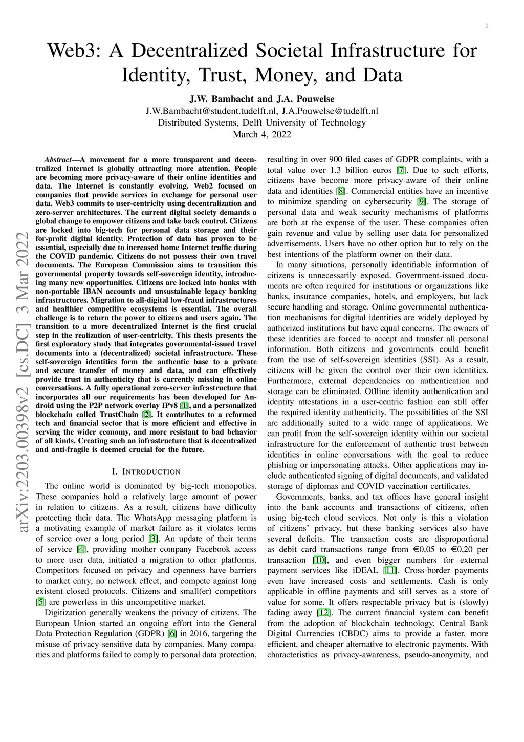 A movement for a more transparent and decentralized Internet is globally attracting more attention. People are becoming more privacy-aware of their online identities and data. The Internet is constantly evolving. Web2 focused on companies that provide services in exchange for personal user data. Web3 commits to user-centricity using decentralization and zero-server architectures. The current digital society demands a global change to empower citizens and take back control. Citizens are locked into big-tech for personal data storage and their for-profit digital identity. Protection of data has proven to be essential, especially due to increased home Internet traffic during the COVID pandemic. Citizens do not possess their own travel documents. The European Commission aims to transition this governmental property towards self-sovereign identity, introducing many new opportunities. Citizens are locked into banks with non-portable IBAN accounts and unsustainable legacy banking infrastructures. Migration to all-digital low-fraud infrastructures and healthier competitive ecosystems is essential. The overall challenge is to return the power to citizens and users again. The transition to a more decentralized Internet is the first crucial step in the realization of user-centricity. This thesis presents the first exploratory study that integrates governmental-issued travel documents into a (decentralized) societal infrastructure. These self-sovereign identities form the authentic base to a private and secure transfer of money and data, and can effectively provide trust in authenticity that is currently missing in online conversations. A fully operational zero-server infrastructure that incorporates all our requirements has been developed for Android using the P2P network overlay IPv8, and a personalized blockchain called TrustChain...