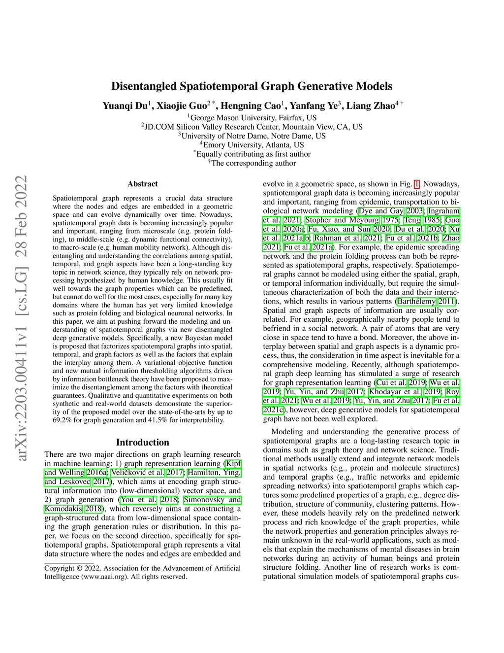 Spatiotemporal graph represents a crucial data structure where the nodes and edges are embedded in a geometric space and can evolve dynamically over time. Nowadays, spatiotemporal graph data is becoming increasingly popular and important, ranging from microscale (e.g. protein folding), to middle-scale (e.g. dynamic functional connectivity), to macro-scale (e.g. human mobility network). Although disentangling and understanding the correlations among spatial, temporal, and graph aspects have been a long-standing key topic in network science, they typically rely on network processing hypothesized by human knowledge. This usually fit well towards the graph properties which can be predefined, but cannot do well for the most cases, especially for many key domains where the human has yet very limited knowledge such as protein folding and biological neuronal networks. In this paper, we aim at pushing forward the modeling and understanding of spatiotemporal graphs via new disentangled deep generative models. Specifically, a new Bayesian model is proposed that factorizes spatiotemporal graphs into spatial, temporal, and graph factors as well as the factors that explain the interplay among them. A variational objective function and new mutual information thresholding algorithms driven by information bottleneck theory have been proposed to maximize the disentanglement among the factors with theoretical guarantees. Qualitative and quantitative experiments on both synthetic and real-world datasets demonstrate the superiority of the proposed model over the state-of-the-arts by up to 69.2% for graph generation and 41.5% for interpretability.