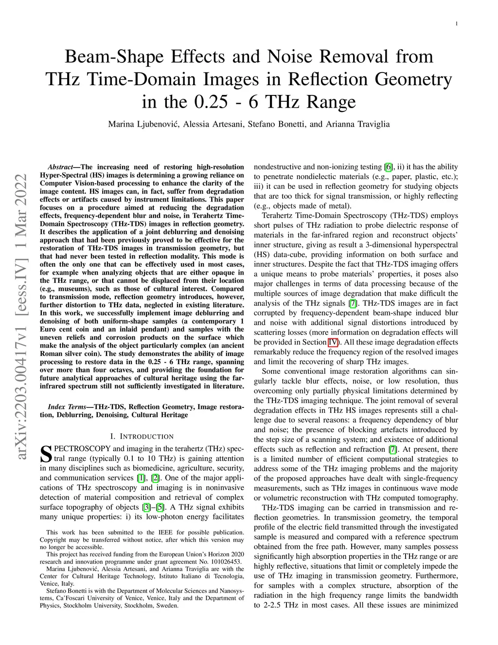 The increasing need of restoring high-resolution Hyper-Spectral (HS) images is determining a growing reliance on Computer Vision-based processing to enhance the clarity of the image content. HS images can, in fact, suffer from degradation effects or artefacts caused by instrument limitations. This paper focuses on a procedure aimed at reducing the degradation effects, frequency-dependent blur and noise, in Terahertz Time-Domain Spectroscopy (THz-TDS) images in reflection geometry. It describes the application of a joint deblurring and denoising approach that had been previously proved to be effective for the restoration of THz-TDS images in transmission geometry, but that had never been tested in reflection modality. This mode is often the only one that can be effectively used in most cases, for example when analyzing objects that are either opaque in the THz range, or that cannot be displaced from their location (e.g., museums), such as those of cultural interest. Compared to transmission mode, reflection geometry introduces, however, further distortion to THz data, neglected in existing literature. In this work, we successfully implement image deblurring and denoising of both uniform-shape samples (a contemporary 1 Euro cent coin and an inlaid pendant) and samples with the uneven reliefs and corrosion products on the surface which make the analysis of the object particularly complex (an ancient Roman silver coin). The study demonstrates the ability of image processing to restore data in the 0.25 - 6 THz range, spanning over more than four octaves, and providing the foundation for future analytical approaches of cultural heritage using the far-infrared spectrum still not sufficiently investigated in literature.