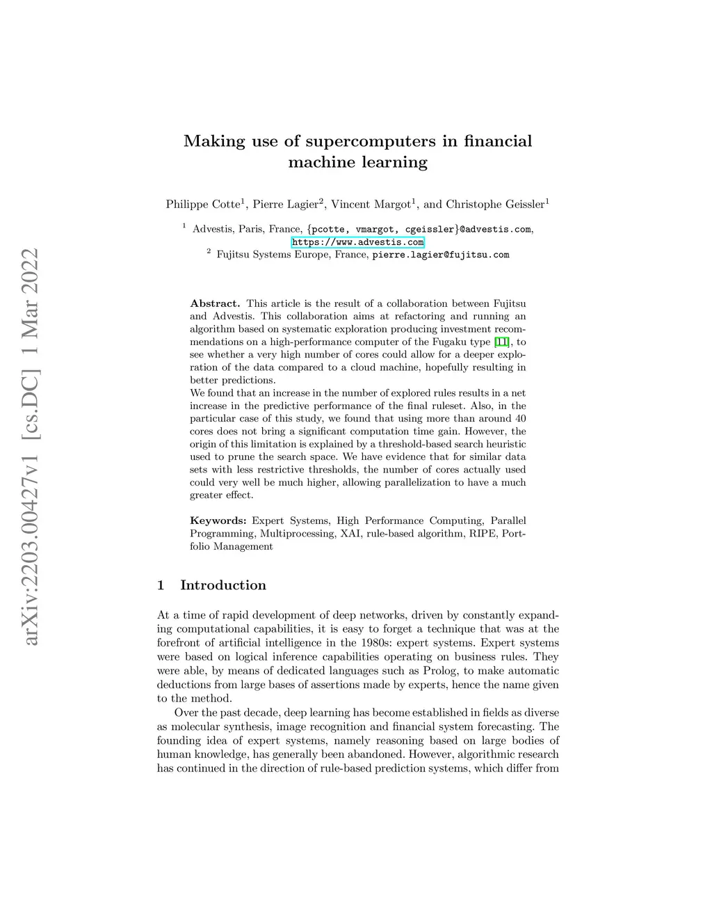 This article is the result of a collaboration between Fujitsu and Advestis. This collaboration aims at refactoring and running an algorithm based on systematic exploration producing investment recommendations on a high-performance computer of the Fugaku, to see whether a very high number of cores could allow for a deeper exploration of the data compared to a cloud machine, hopefully resulting in better predictions. We found that an increase in the number of explored rules results in a net increase in the predictive performance of the final ruleset. Also, in the particular case of this study, we found that using more than around 40 cores does not bring a significant computation time gain. However, the origin of this limitation is explained by a threshold-based search heuristic used to prune the search space. We have evidence that for similar data sets with less restrictive thresholds, the number of cores actually used could very well be much higher, allowing parallelization to have a much greater effect.