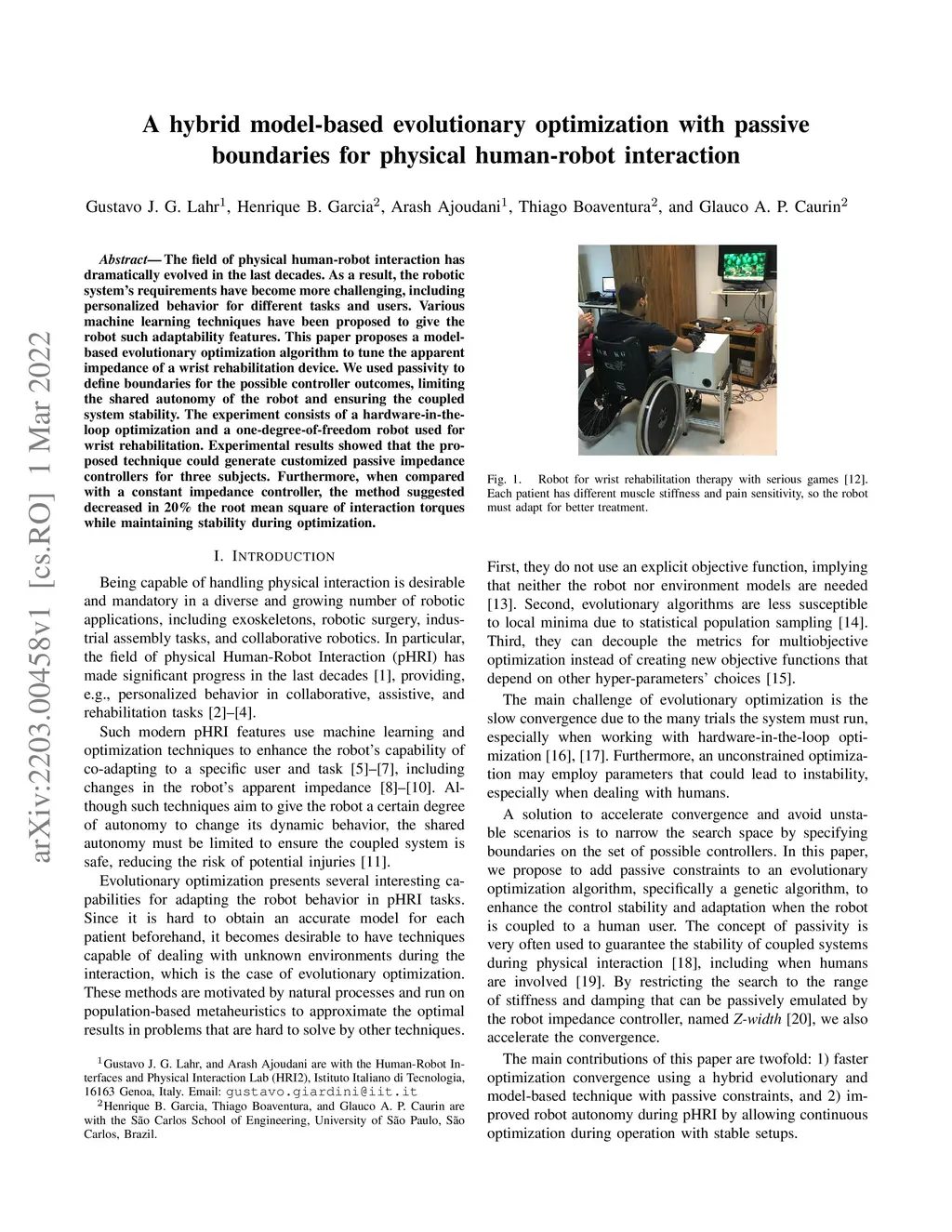 The field of physical human-robot interaction has dramatically evolved in the last decades. As a result, the robotic system's requirements have become more challenging, including personalized behavior for different tasks and users. Various machine learning techniques have been proposed to give the robot such adaptability features. This paper proposes a model-based evolutionary optimization algorithm to tune the apparent impedance of a wrist rehabilitation device. We used passivity to define boundaries for the possible controller outcomes, limiting the shared autonomy of the robot and ensuring the coupled system stability. The experiment consists of a hardware-in-the-loop optimization and a one-degree-of-freedom robot used for wrist rehabilitation. Experimental results showed that the proposed technique could generate customized passive impedance controllers for three subjects. Furthermore, when compared with a constant impedance controller, the method suggested decreased in 20\% the root mean square of interaction torques while maintaining stability during optimization.