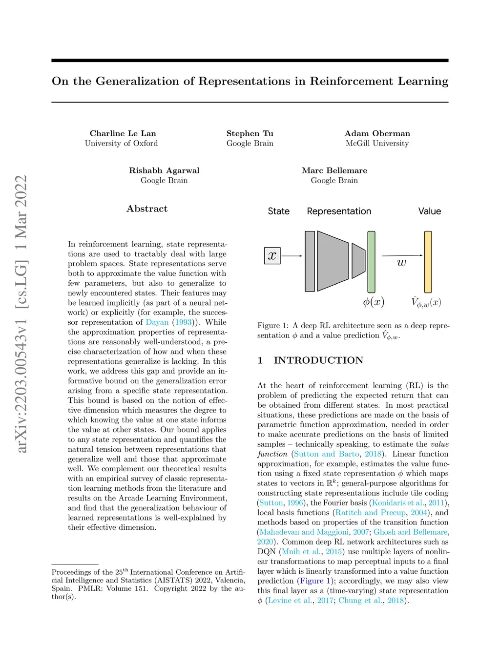 In reinforcement learning, state representations are used to tractably deal with large problem spaces. State representations serve both to approximate the value function with few parameters, but also to generalize to newly encountered states. Their features may be learned implicitly (as part of a neural network) or explicitly (for example, the successor representation of \citet{dayan1993improving}). While the approximation properties of representations are reasonably well-understood, a precise characterization of how and when these representations generalize is lacking. In this work, we address this gap and provide an informative bound on the generalization error arising from a specific state representation. This bound is based on the notion of effective dimension which measures the degree to which knowing the value at one state informs the value at other states. Our bound applies to any state representation and quantifies the natural tension between representations that generalize well and those that approximate well. We complement our theoretical results with an empirical survey of classic representation learning methods from the literature and results on the Arcade Learning Environment, and find that the generalization behaviour of learned representations is well-explained by their effective dimension.