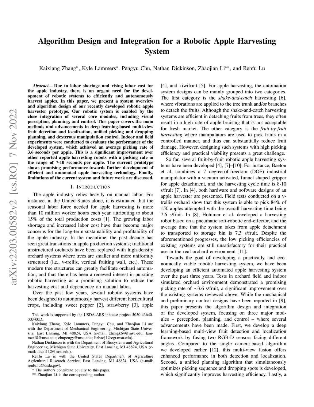 Algorithm Design and Integration for a Robotic Apple Harvesting System