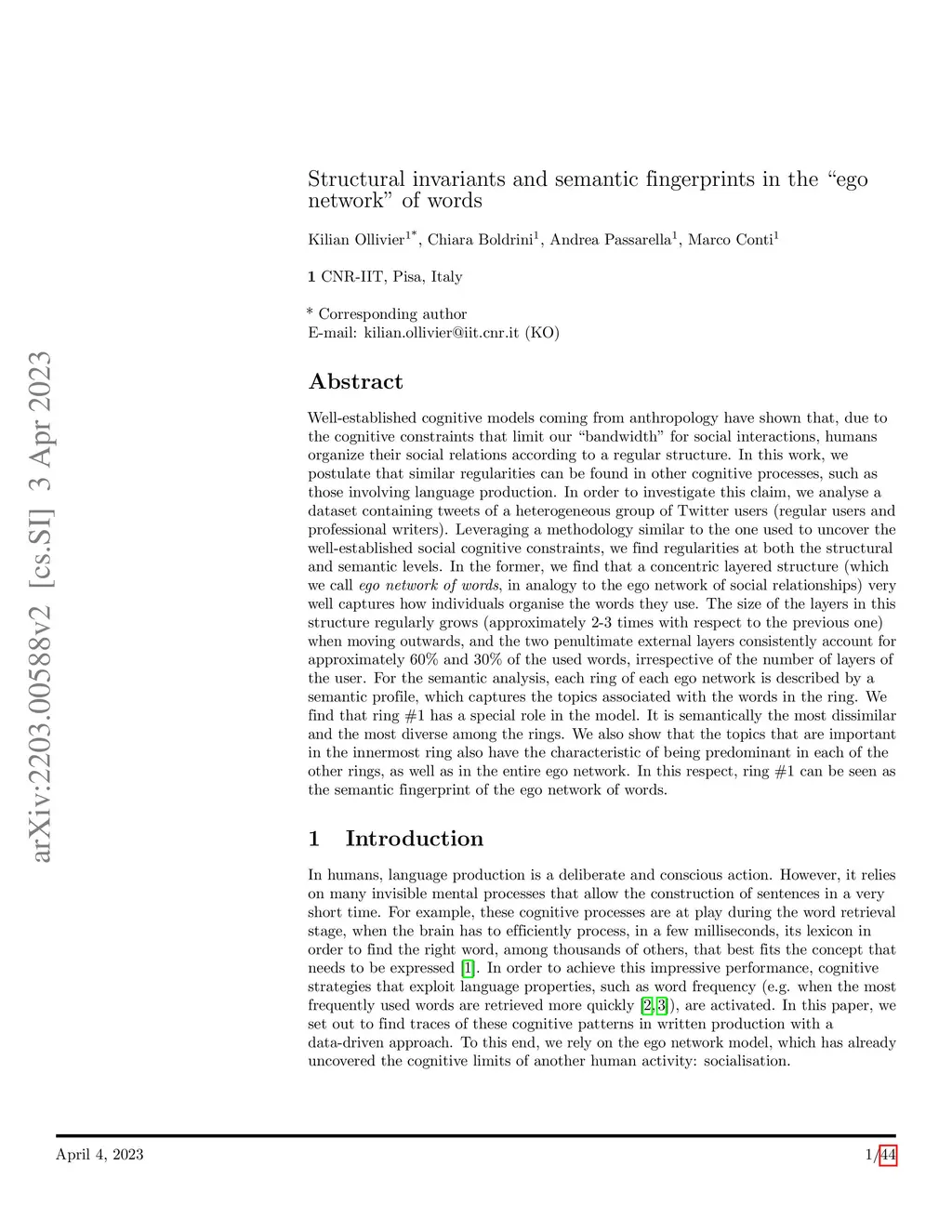 Well-established cognitive models coming from anthropology have shown that, due to the cognitive constraints that limit our "bandwidth" for social interactions, humans organize their social relations according to a regular structure. In this work, we postulate that similar regularities can be found in other cognitive processes, such as those involving language production. In order to investigate this claim, we analyse a dataset containing tweets of a heterogeneous group of Twitter users (regular users and professional writers). Leveraging a methodology similar to the one used to uncover the well-established social cognitive constraints, we find regularities at both the structural and semantic level. At the former, we find that a concentric layered structure (which we call ego network of words, in analogy to the ego network of social relationships) very well captures how individuals organise the words they use. The size of the layers in this structure regularly grows (approximately 2-3 times with respect to the previous one) when moving outwards, and the two penultimate external layers consistently account for approximately 60% and 30% of the used words, irrespective of the number of the total number of layers of the user. For the semantic analysis, each ring of each ego network is described by a semantic profile, which captures the topics associated with the words in the ring. We find that ring #1 has a special role in the model. It is semantically the most dissimilar and the most diverse among the rings. We also show that the topics that are important in the innermost ring also have the characteristic of being predominant in each of the other rings, as well as in the entire ego network. In this respect, ring #1 can be seen as the semantic fingerprint of the ego network of words.