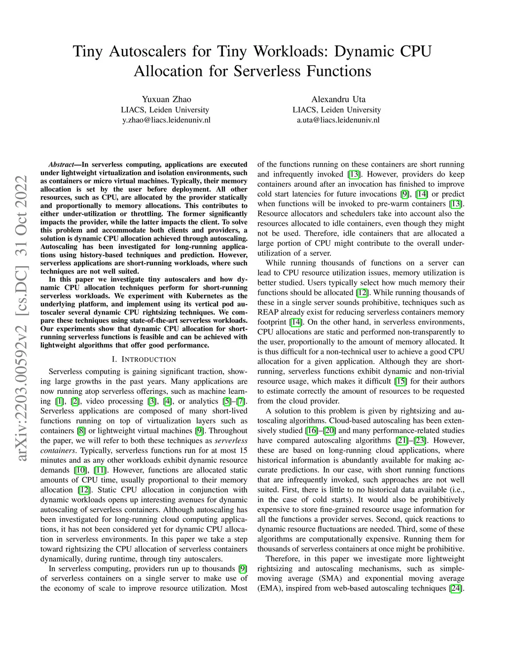 In serverless computing, applications are executed under lightweight virtualization and isolation environments, such as containers or micro virtual machines. Typically, their memory allocation is set by the user before deployment. All other resources, such as CPU, are allocated by the provider statically and proportionally to memory allocations. This contributes to either under-utilization or throttling. The former significantly impacts the provider, while the latter impacts the client. To solve this problem and accommodate both clients and providers, a solution is dynamic CPU allocation achieved through autoscaling. Autoscaling has been investigated for long-running applications using history-based techniques and prediction. However, serverless applications are short-running workloads, where such techniques are not well suited. In this paper, we investigate tiny autoscalers and how dynamic CPU allocation techniques perform for short-running serverless workloads. We experiment with Kubernetes as the underlying platform and implement using its vertical pod autoscaler several dynamic CPU rightsizing techniques. We compare these techniques using state-of-the-art serverless workloads. Our experiments show that dynamic CPU allocation for short-running serverless functions is feasible and can be achieved with lightweight algorithms that offer good performance.
