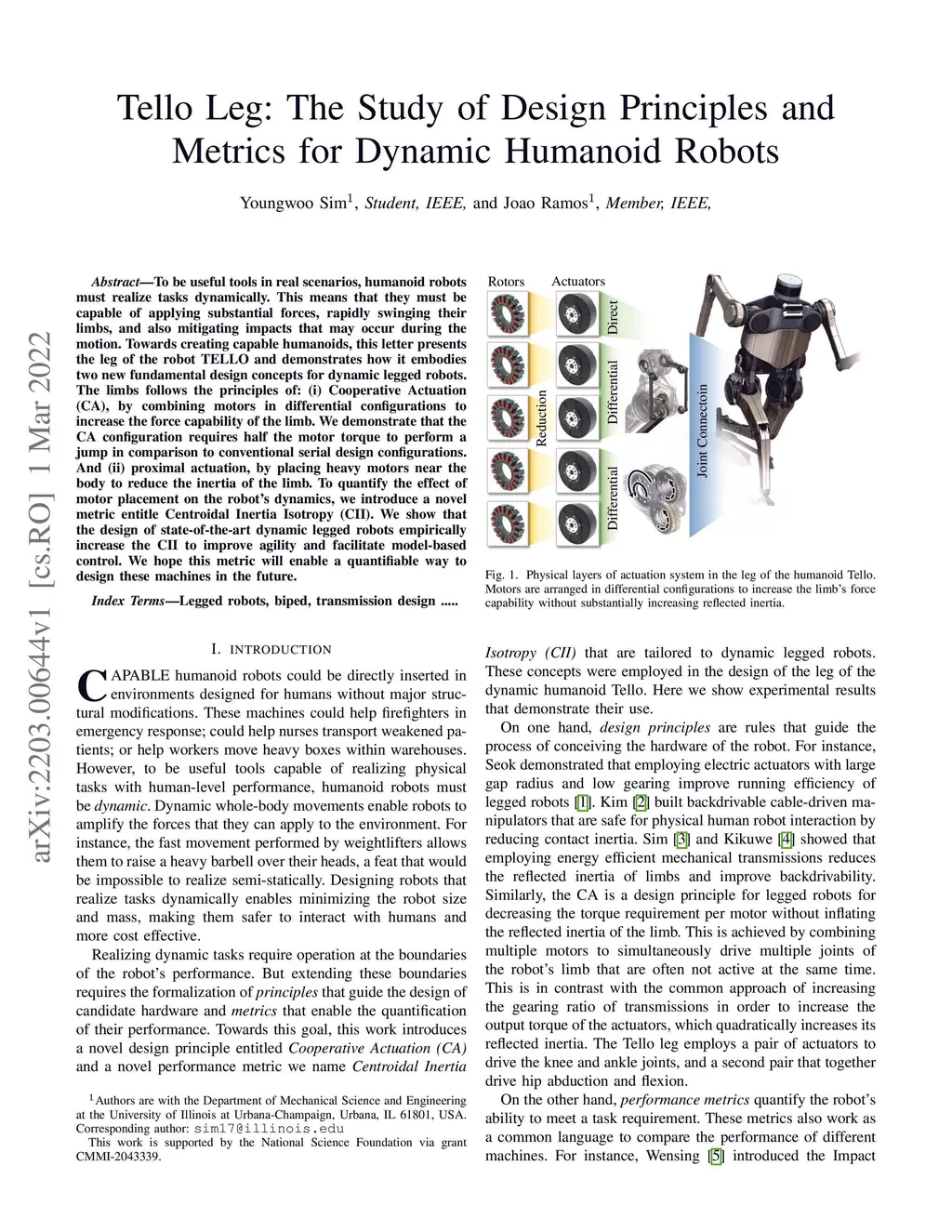 To be useful tools in real scenarios, humanoid robots must realize tasks dynamically. This means that they must be capable of applying substantial forces, rapidly swinging their limbs, and also mitigating impacts that may occur during the motion. Towards creating capable humanoids, this letter presents the leg of the robot TELLO and demonstrates how it embodies two new fundamental design concepts for dynamic legged robots. The limbs follows the principles of: (i) Cooperative Actuation (CA), by combining motors in differential configurations to increase the force capability of the limb. We demonstrate that the CA configuration requires half the motor torque to perform a jump in comparison to conventional serial design configurations. And (ii) proximal actuation, by placing heavy motors near the body to reduce the inertia of the limb. To quantify the effect of motor placement on the robot's dynamics, we introduce a novel metric entitle Centroidal Inertia Isotropy (CII). We show that the design of state-of-the-art dynamic legged robots empirically increase the CII to improve agility and facilitate model-based control. We hope this metric will enable a quantifiable way to design these machines in the future.