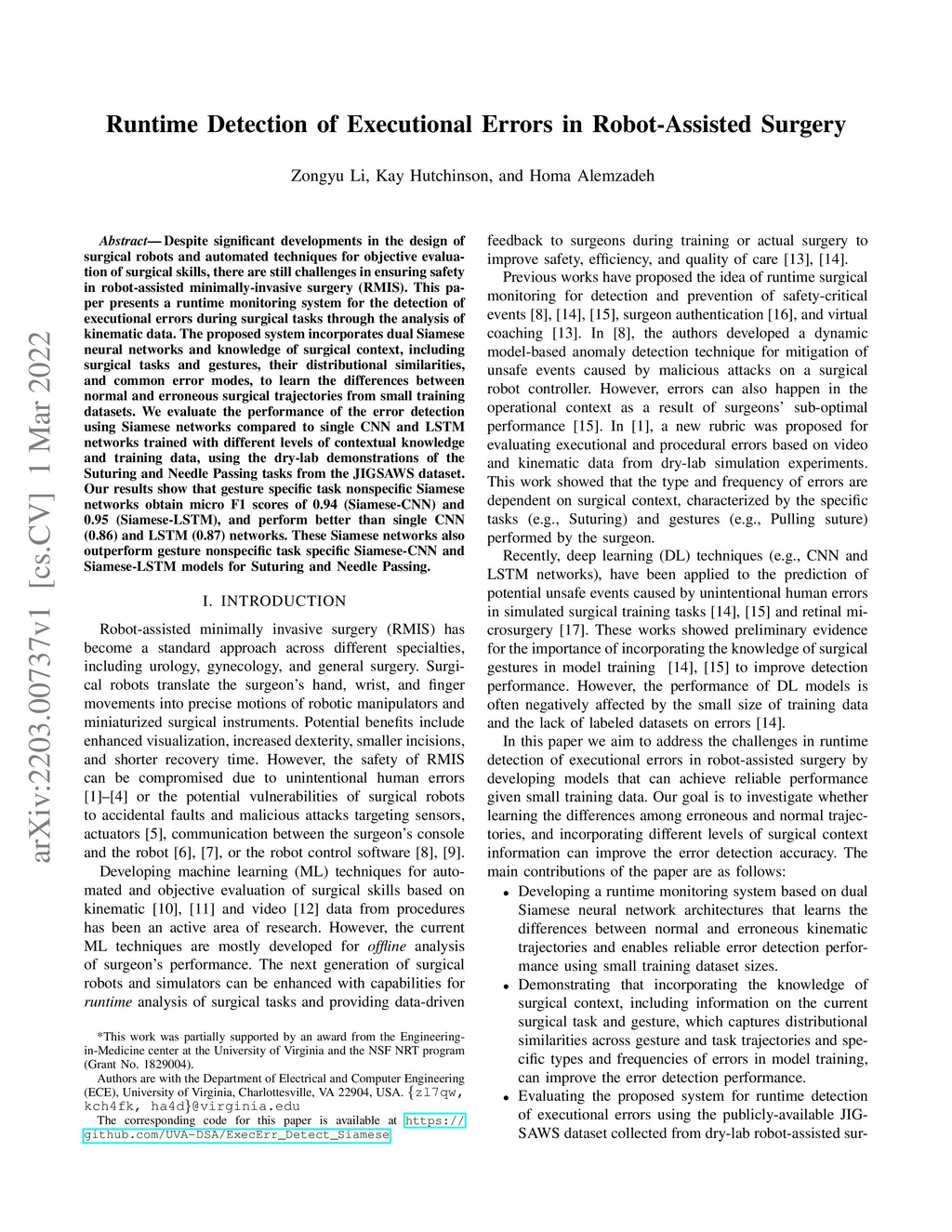Despite significant developments in the design of surgical robots and automated techniques for objective evaluation of surgical skills, there are still challenges in ensuring safety in robot-assisted minimally-invasive surgery (RMIS). This paper presents a runtime monitoring system for the detection of executional errors during surgical tasks through the analysis of kinematic data. The proposed system incorporates dual Siamese neural networks and knowledge of surgical context, including surgical tasks and gestures, their distributional similarities, and common error modes, to learn the differences between normal and erroneous surgical trajectories from small training datasets. We evaluate the performance of the error detection using Siamese networks compared to single CNN and LSTM networks trained with different levels of contextual knowledge and training data, using the dry-lab demonstrations of the Suturing and Needle Passing tasks from the JIGSAWS dataset. Our results show that gesture specific task nonspecific Siamese networks obtain micro F1 scores of 0.94 (Siamese-CNN) and 0.95 (Siamese-LSTM), and perform better than single CNN (0.86) and LSTM (0.87) networks. These Siamese networks also outperform gesture nonspecific task specific Siamese-CNN and Siamese-LSTM models for Suturing and Needle Passing.