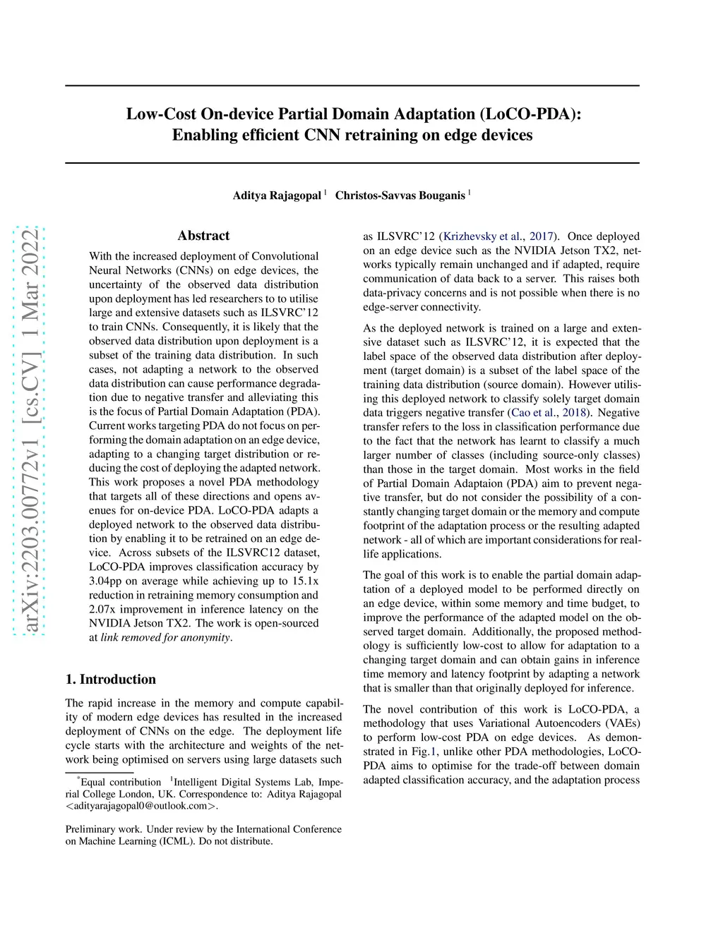 With the increased deployment of Convolutional Neural Networks (CNNs) on edge devices, the uncertainty of the observed data distribution upon deployment has led researchers to to utilise large and extensive datasets such as ILSVRC'12 to train CNNs. Consequently, it is likely that the observed data distribution upon deployment is a subset of the training data distribution. In such cases, not adapting a network to the observed data distribution can cause performance degradation due to negative transfer and alleviating this is the focus of Partial Domain Adaptation (PDA). Current works targeting PDA do not focus on performing the domain adaptation on an edge device, adapting to a changing target distribution or reducing the cost of deploying the adapted network. This work proposes a novel PDA methodology that targets all of these directions and opens avenues for on-device PDA. LoCO-PDA adapts a deployed network to the observed data distribution by enabling it to be retrained on an edge device. Across subsets of the ILSVRC12 dataset, LoCO-PDA improves classification accuracy by 3.04pp on average while achieving up to 15.1x reduction in retraining memory consumption and 2.07x improvement in inference latency on the NVIDIA Jetson TX2. The work is open-sourced at \emph{link removed for anonymity}.