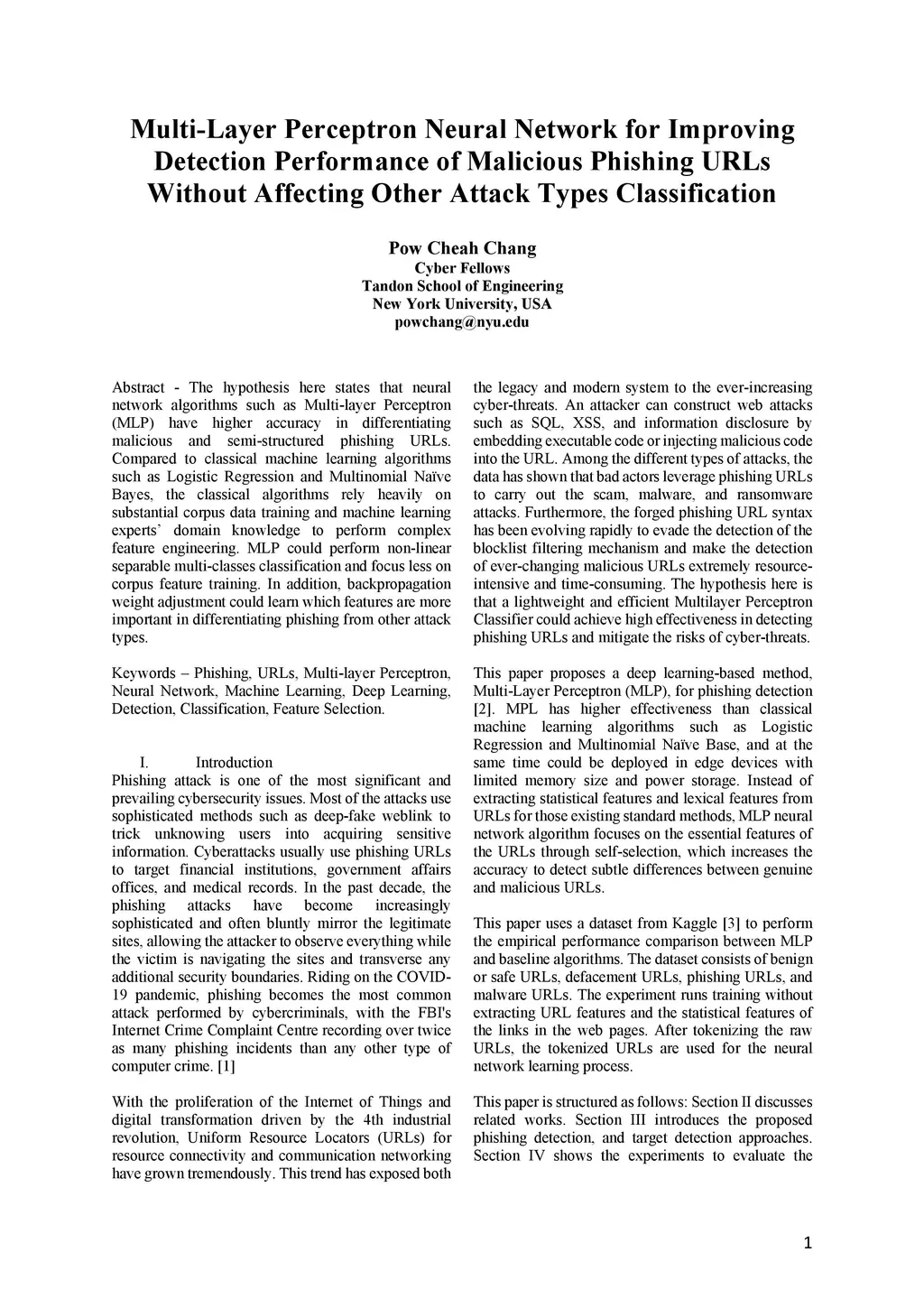 The hypothesis here states that neural network algorithms such as Multi-layer Perceptron (MLP) have higher accuracy in differentiating malicious and semi-structured phishing URLs. Compared to classical machine learning algorithms such as Logistic Regression and Multinomial Naive Bayes, the classical algorithms rely heavily on substantial corpus data training and machine learning experts' domain knowledge to perform complex feature engineering. MLP could perform non-linear separable multi-classes classification and focus less on corpus feature training. In addition, backpropagation weight adjustment could learn which features are more important in differentiating phishing from other attack types.