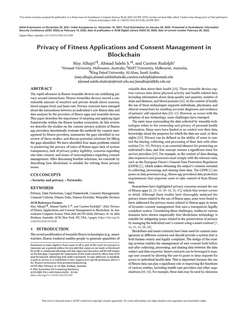 Privacy of Fitness Applications and Consent Management in Blockchain