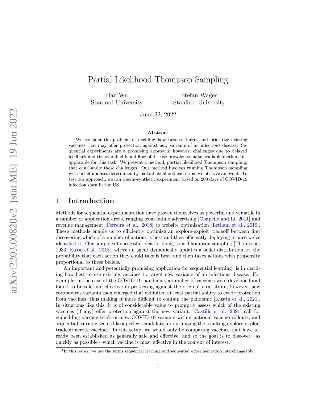 We consider the problem of deciding how best to target and prioritize existing vaccines that may offer protection against new variants of an infectious disease. Sequential experiments are a promising approach; however, challenges due to delayed feedback and the overall ebb and flow of disease prevalence make available methods inapplicable for this task. We present a method, partial likelihood Thompson sampling, that can handle these challenges. Our method involves running Thompson sampling with belief updates determined by partial likelihood each time we observe an event. To test our approach, we ran a semi-synthetic experiment based on 200 days of COVID-19 infection data in the US.