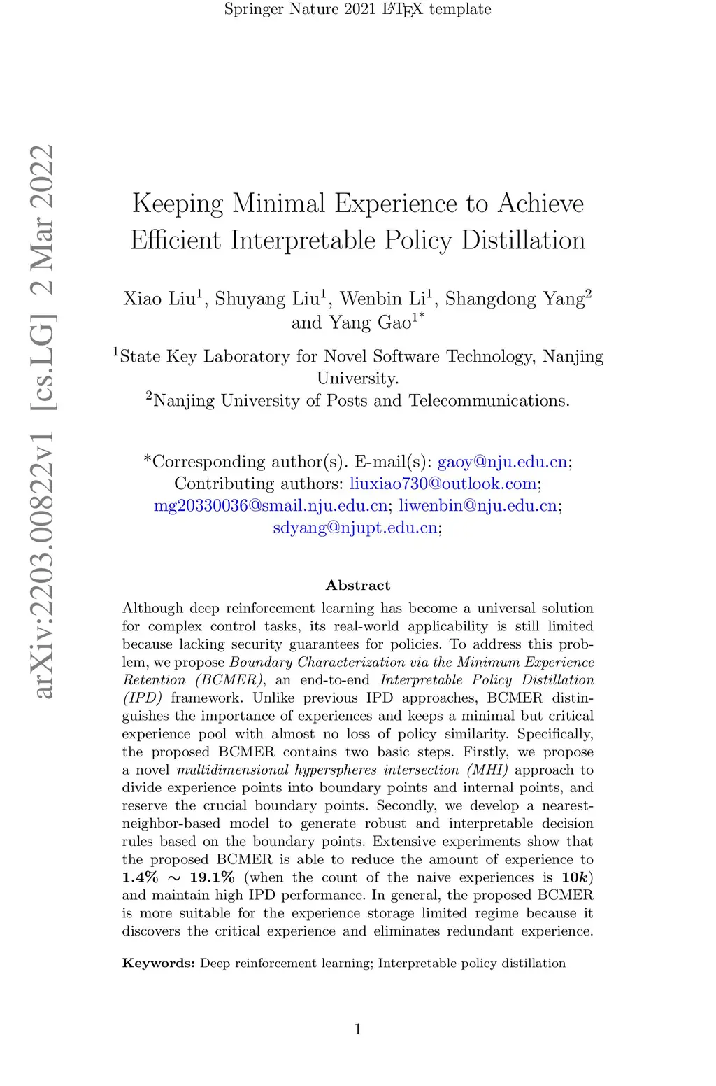 Although deep reinforcement learning has become a universal solution for complex control tasks, its real-world applicability is still limited because lacking security guarantees for policies. To address this problem, we propose Boundary Characterization via the Minimum Experience Retention (BCMER), an end-to-end Interpretable Policy Distillation (IPD) framework. Unlike previous IPD approaches, BCMER distinguishes the importance of experiences and keeps a minimal but critical experience pool with almost no loss of policy similarity. Specifically, the proposed BCMER contains two basic steps. Firstly, we propose a novel multidimensional hyperspheres intersection (MHI) approach to divide experience points into boundary points and internal points, and reserve the crucial boundary points. Secondly, we develop a nearest-neighbor-based model to generate robust and interpretable decision rules based on the boundary points. Extensive experiments show that the proposed BCMER is able to reduce the amount of experience to 1.4%~19.1% (when the count of the naive experiences is 10k) and maintain high IPD performance. In general, the proposed BCMER is more suitable for the experience storage limited regime because it discovers the critical experience and eliminates redundant experience.