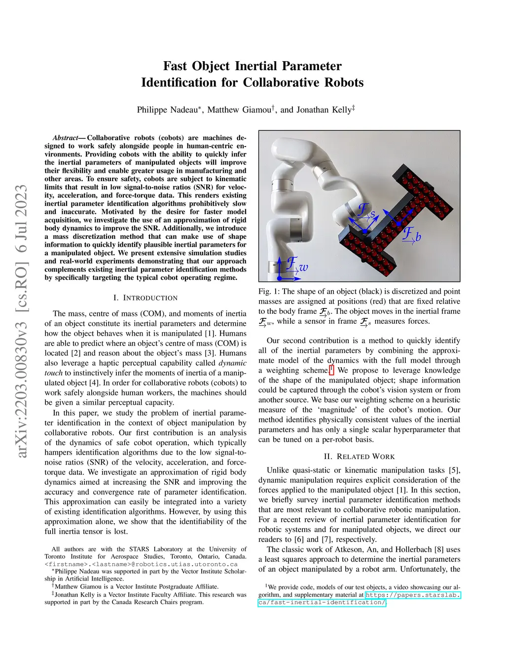 Collaborative robots (cobots) are machines designed to work safely alongside people in human-centric environments. Providing cobots with the ability to quickly infer the inertial parameters of manipulated objects will improve their flexibility and enable greater usage in manufacturing and other areas. To ensure safety, cobots are subject to kinematic limits that result in low signal-to-noise ratios (SNR) for velocity, acceleration, and force-torque data. This renders existing inertial parameter identification algorithms prohibitively slow and inaccurate. Motivated by the desire for faster model acquisition, we investigate the use of an approximation of rigid body dynamics to improve the SNR. Additionally, we introduce a mass discretization method that can make use of shape information to quickly identify plausible inertial parameters for a manipulated object. We present extensive simulation studies and real-world experiments demonstrating that our approach complements existing inertial parameter identification methods by specifically targeting the typical cobot operating regime.