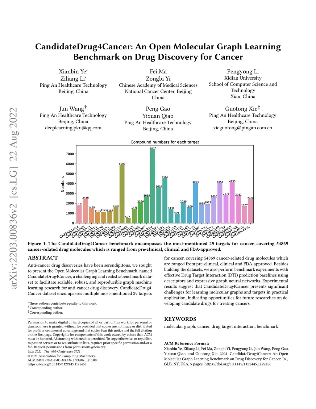 Anti-cancer drug discoveries have been serendipitous, we sought to present the Open Molecular Graph Learning Benchmark, named CandidateDrug4Cancer, a challenging and realistic benchmark dataset to facilitate scalable, robust, and reproducible graph machine learning research for anti-cancer drug discovery. CandidateDrug4Cancer dataset encompasses multiple most-mentioned 29 targets for cancer, covering 54869 cancer-related drug molecules which are ranged from pre-clinical, clinical and FDA-approved. Besides building the datasets, we also perform benchmark experiments with effective Drug Target Interaction (DTI) prediction baselines using descriptors and expressive graph neural networks. Experimental results suggest that CandidateDrug4Cancer presents significant challenges for learning molecular graphs and targets in practical application, indicating opportunities for future researches on developing candidate drugs for treating cancers.