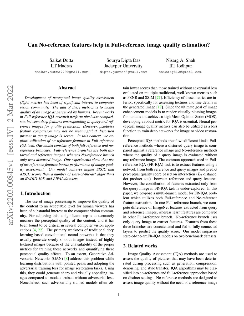 Development of perceptual image quality assessment (IQA) metrics has been of significant interest to computer vision community. The aim of these metrics is to model quality of an image as perceived by humans. Recent works in Full-reference IQA research perform pixelwise comparison between deep features corresponding to query and reference images for quality prediction. However, pixelwise feature comparison may not be meaningful if distortion present in query image is severe. In this context, we explore utilization of no-reference features in Full-reference IQA task. Our model consists of both full-reference and no-reference branches. Full-reference branches use both distorted and reference images, whereas No-reference branch only uses distorted image. Our experiments show that use of no-reference features boosts performance of image quality assessment. Our model achieves higher SRCC and KRCC scores than a number of state-of-the-art algorithms on KADID-10K and PIPAL datasets.